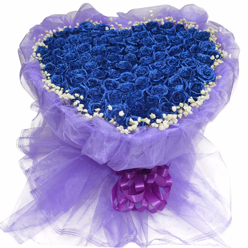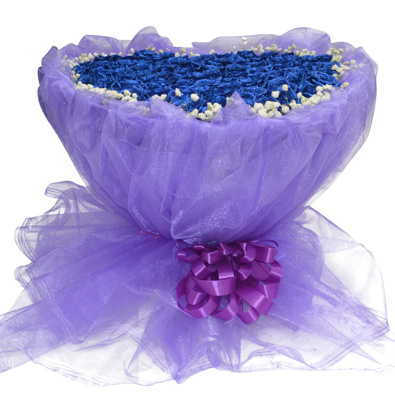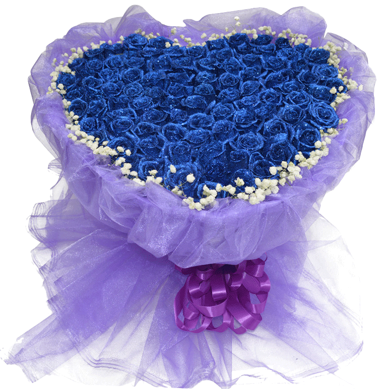 花 材:99朵顶级蓝色妖姬心形包扎,搭配满天星外围环绕。