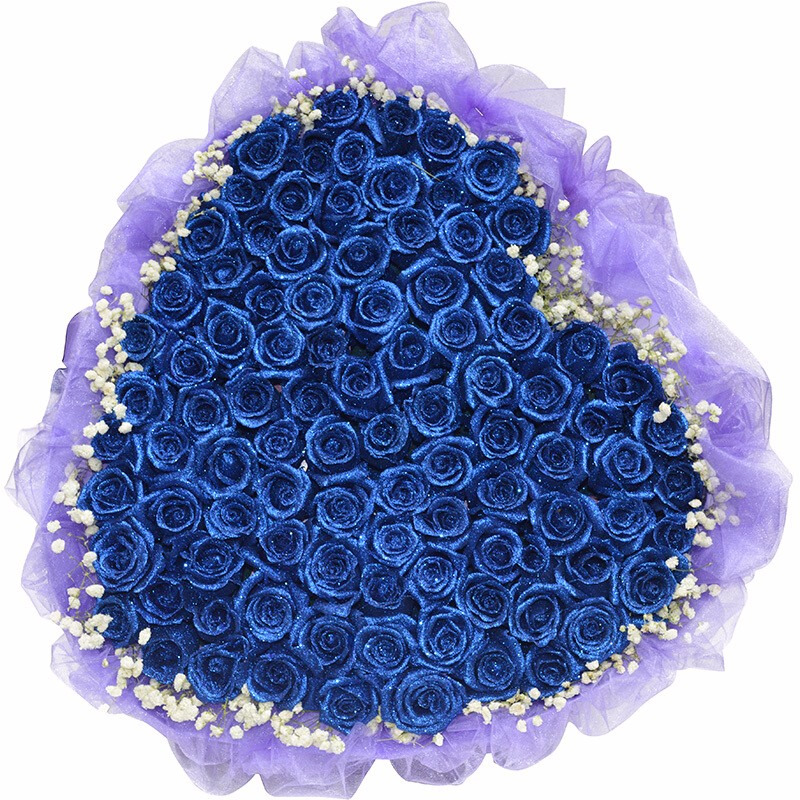 花材: 99朵顶级蓝色妖姬心形包扎,搭配满天星外围环绕。