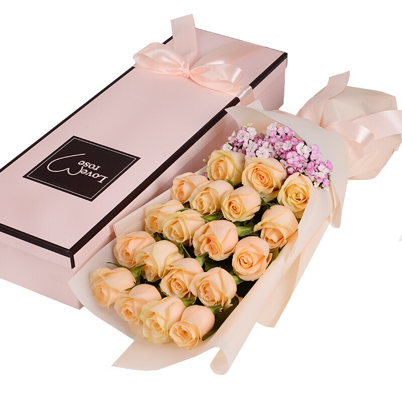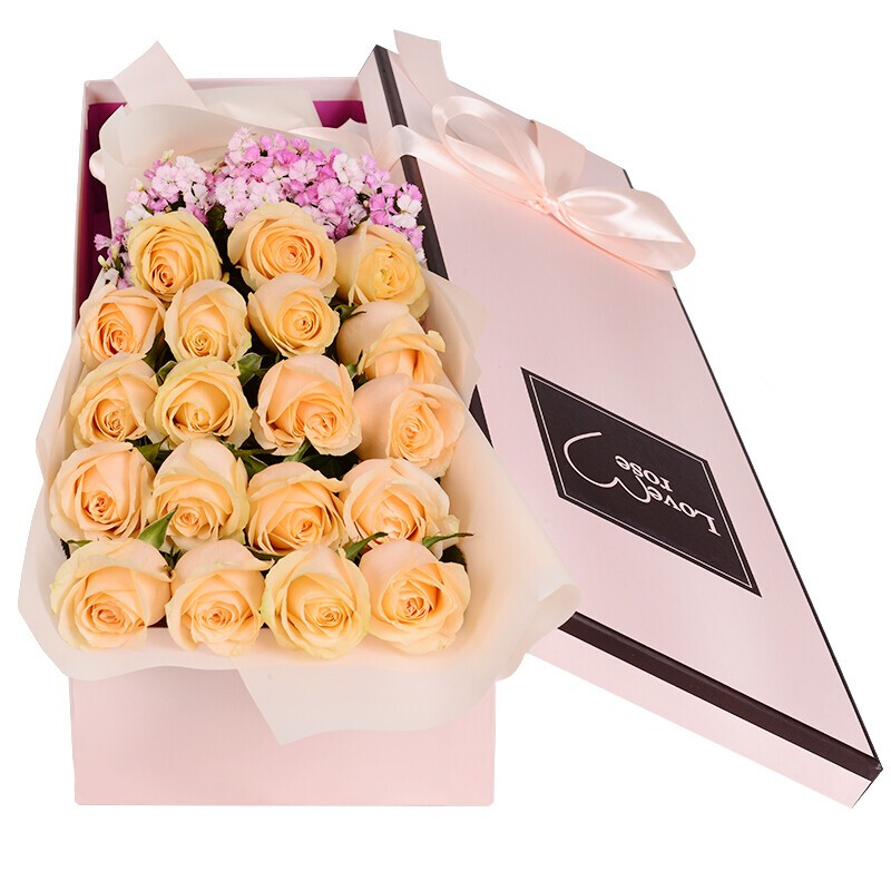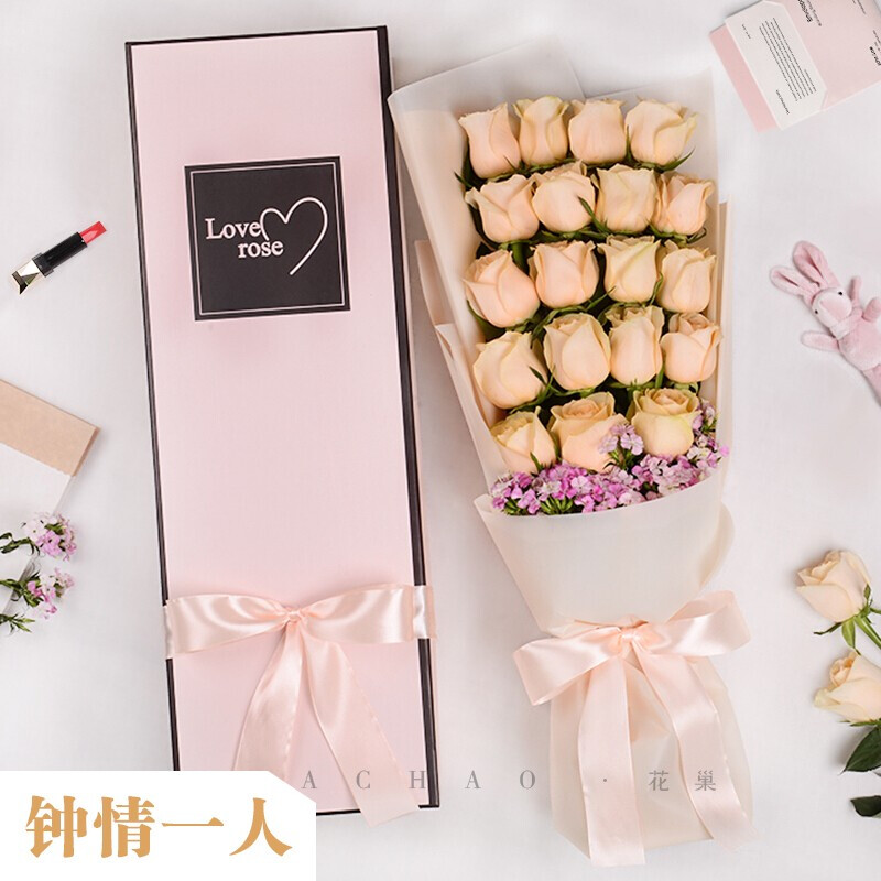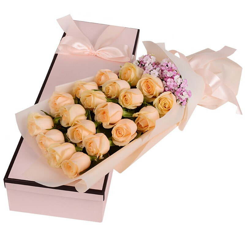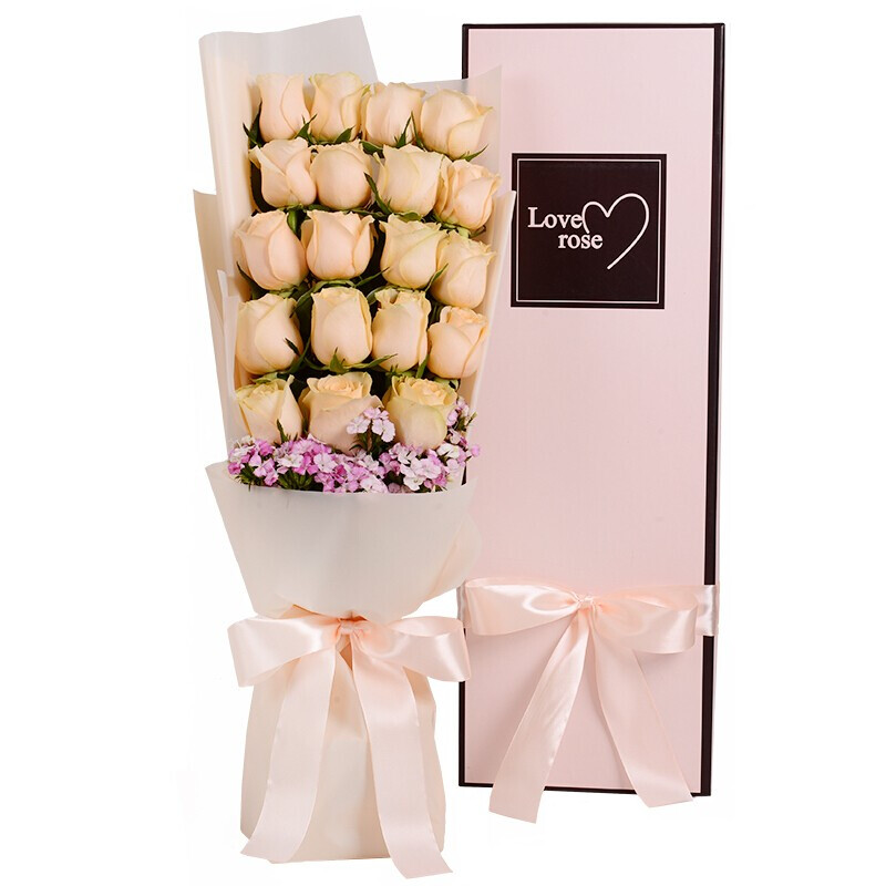 花材: 19朵香槟玫瑰,搭配相思梅。