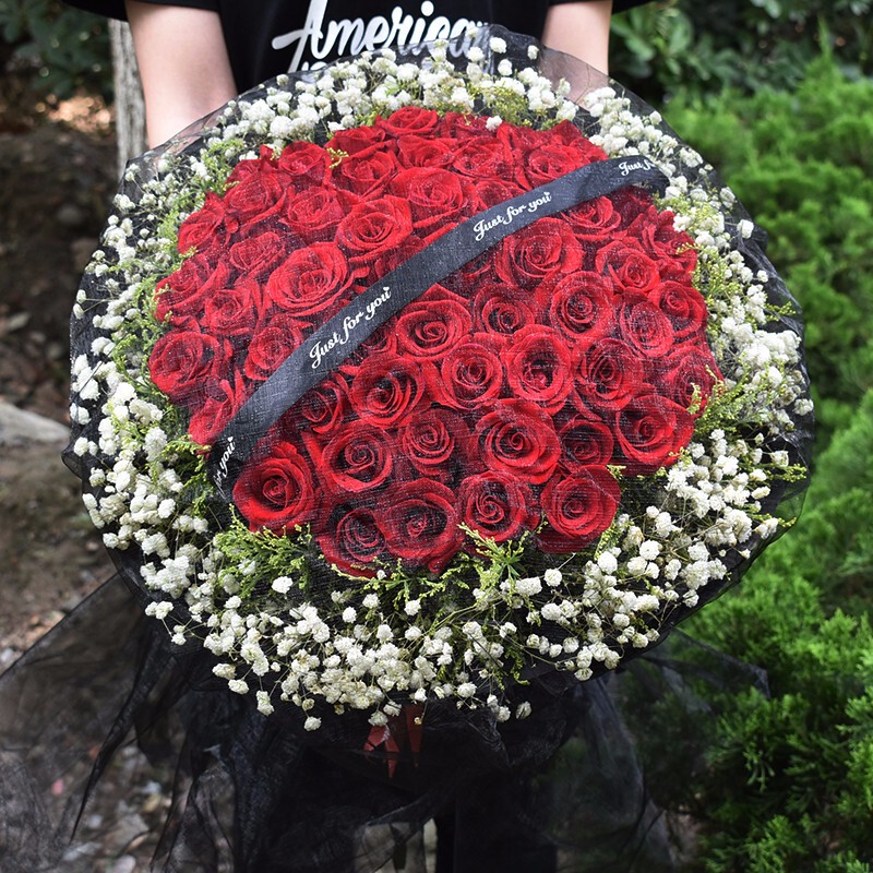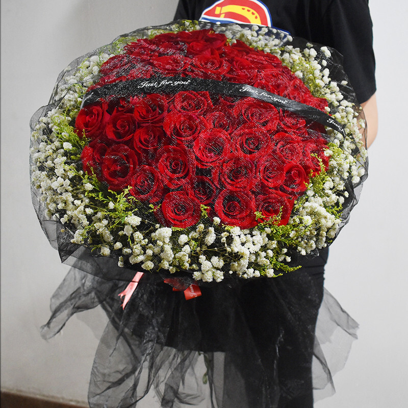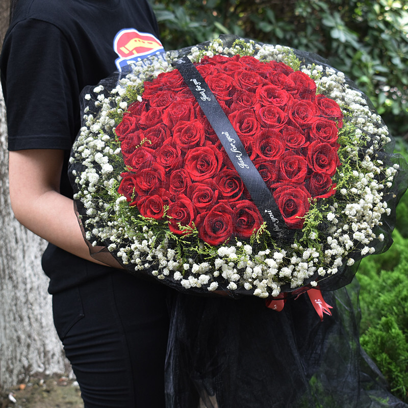 花 材:33枝红玫瑰,搭配满天星黄莺外围环绕。