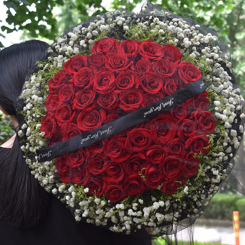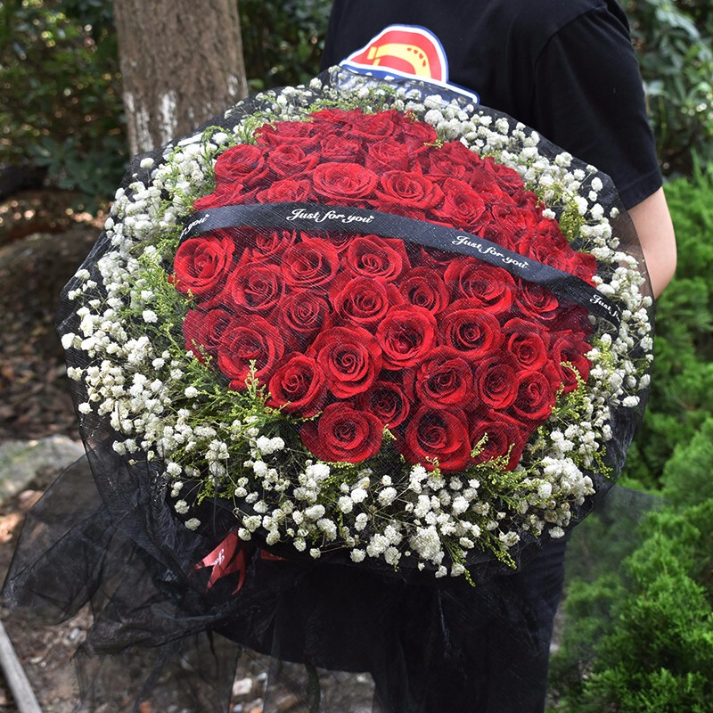 花材: 33枝红玫瑰,搭配满天星黄莺外围环绕。