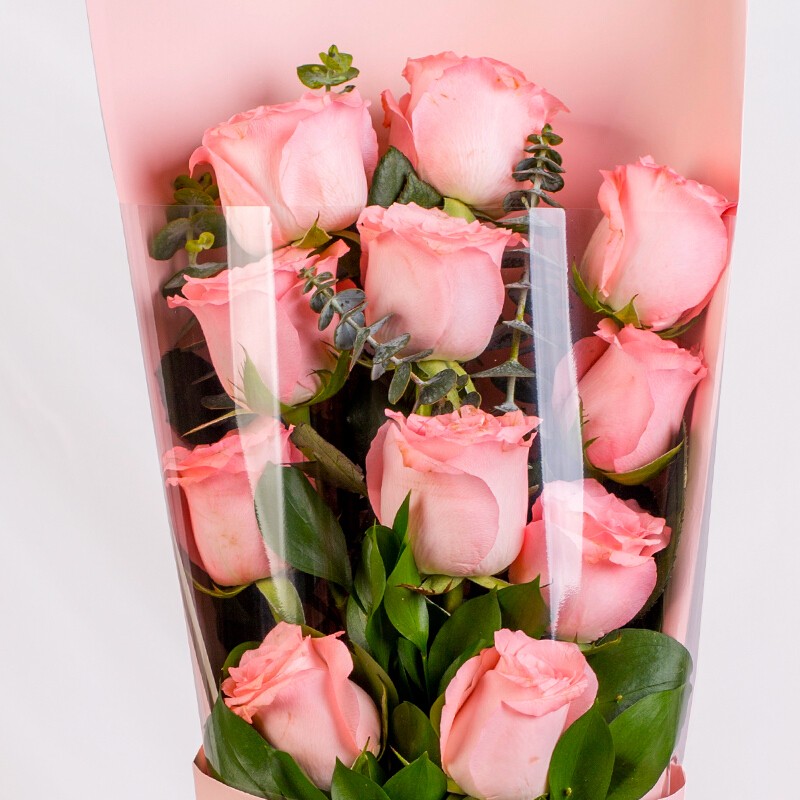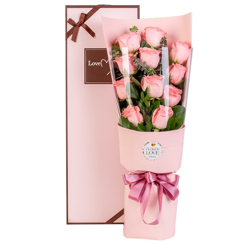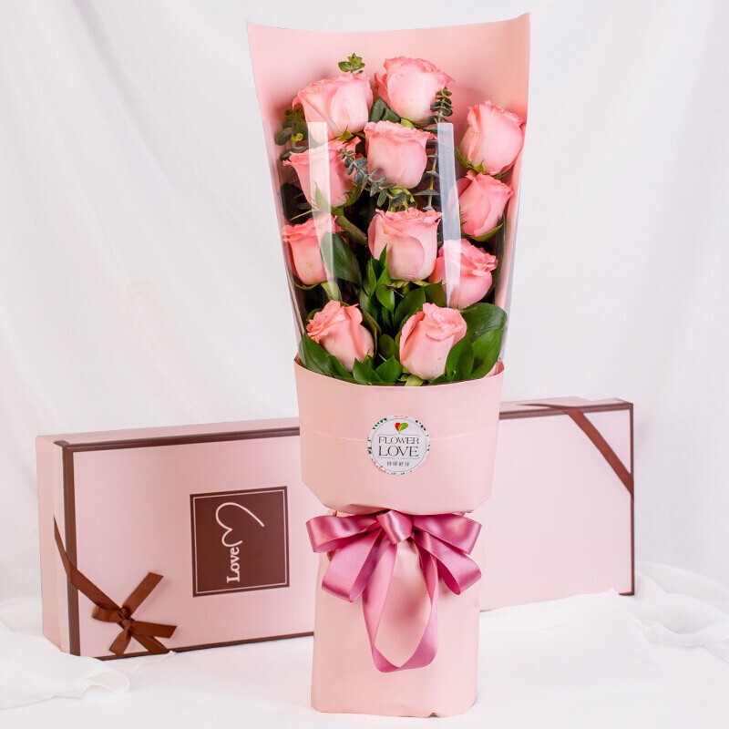 花 材:11朵粉玫瑰,搭配尤加利叶、绿叶点缀。