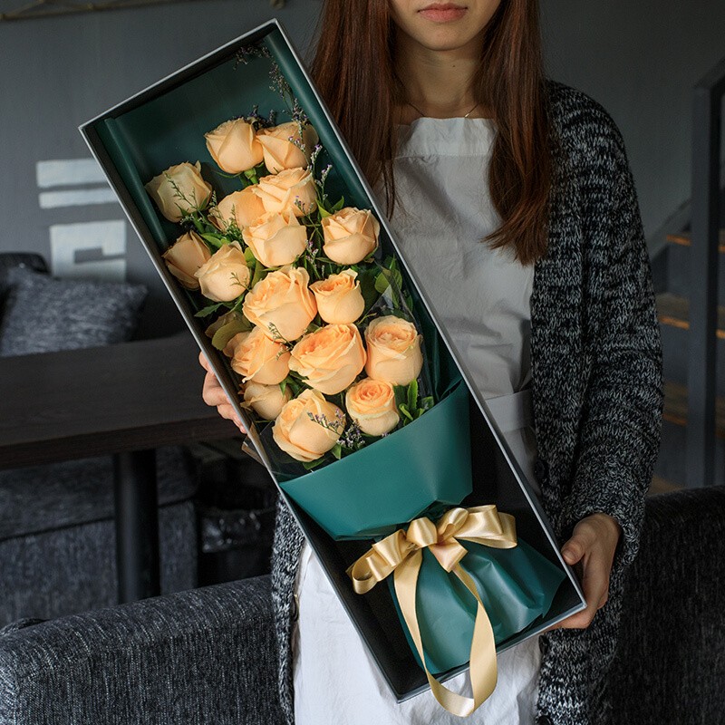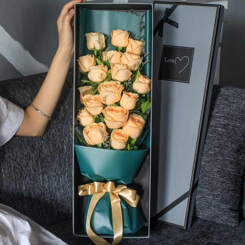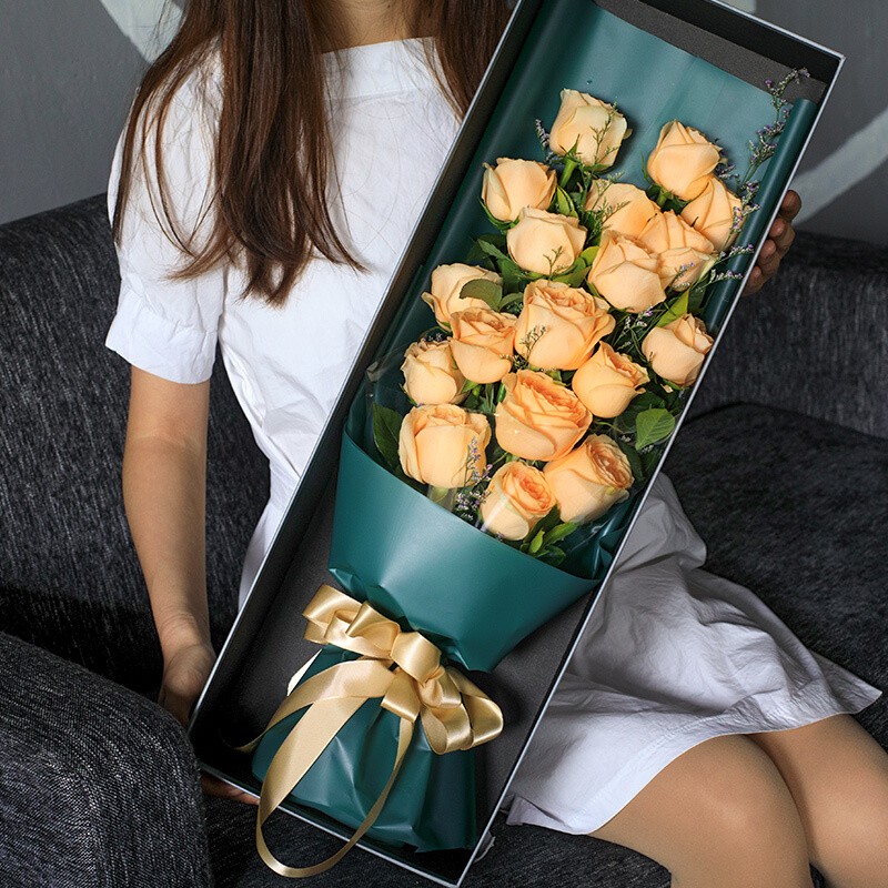 花材: 19朵香槟玫瑰,搭配水晶草、绿叶装饰。