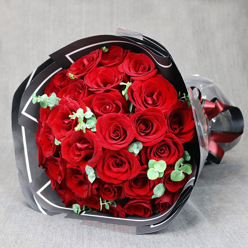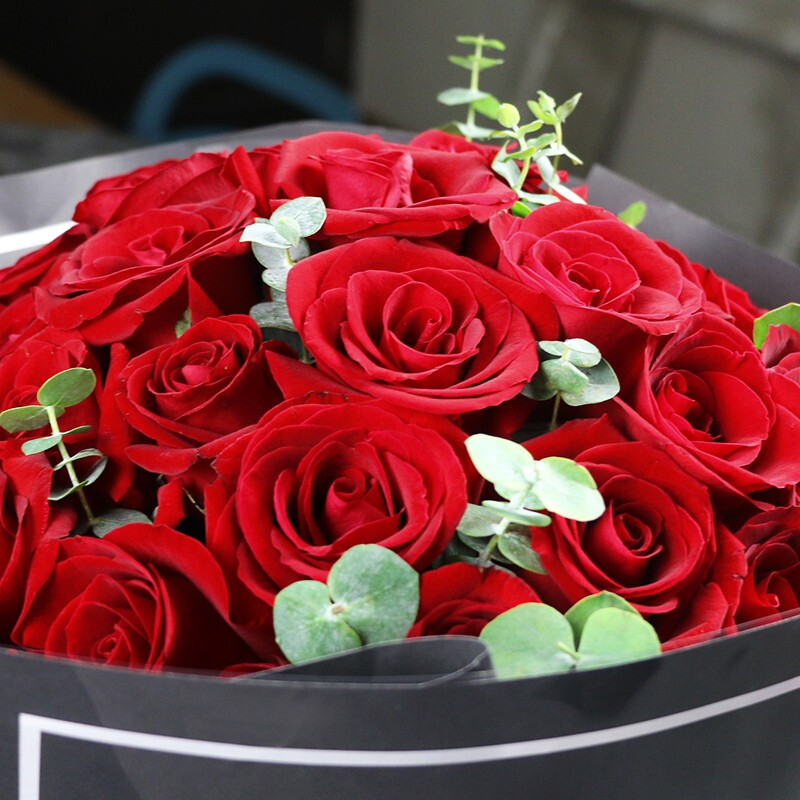 花材: 33朵红玫瑰,搭配尤加利叶装饰。