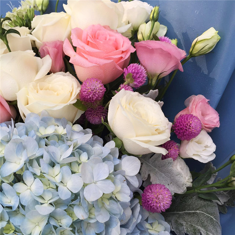 花材: 11支白玫瑰、3支戴安娜粉玫瑰、1支精品蓝色绣球,搭配6支粉色/白色洋桔梗,银叶菊、千日红,尤加利叶等装饰。