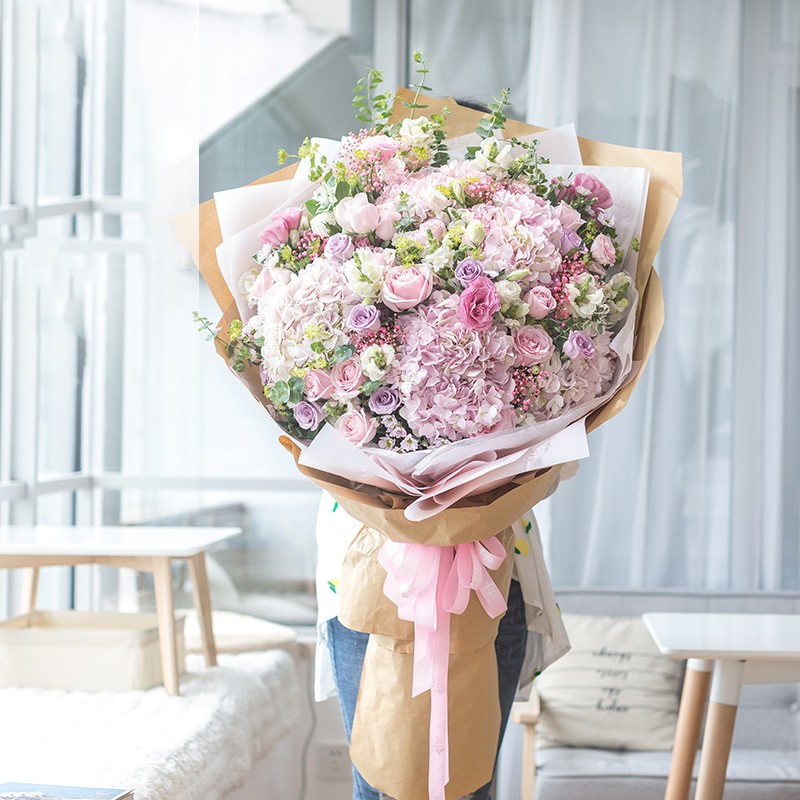 花材: 5支粉绣球、11支粉玫瑰、11支紫玫瑰、6支粉色洋桔梗、6支白色洋桔梗,搭配适量白色金鱼草、叶上黄金、黄莺草、粉色满天星、尤加利叶装饰。(花束高度:1.2 - 1.3m 左右,人工测量有误差,具体以实物为准)