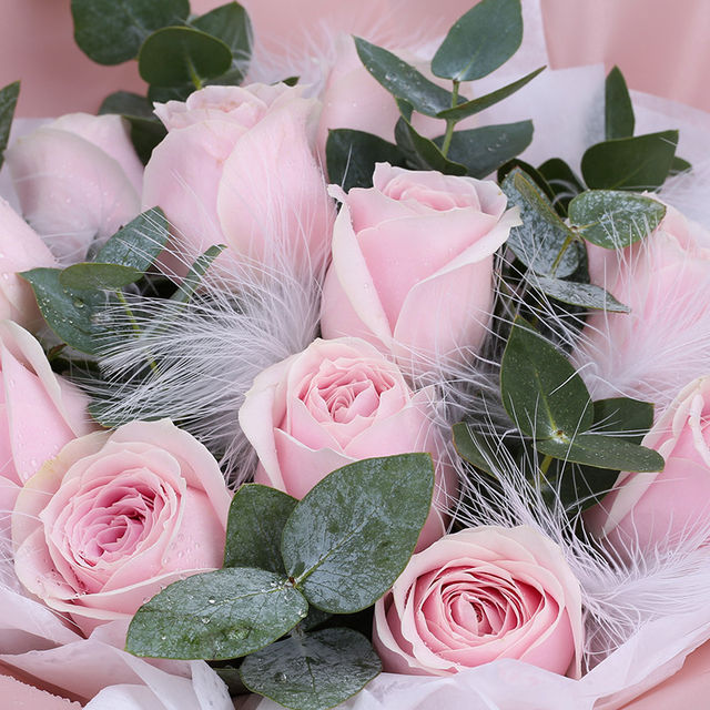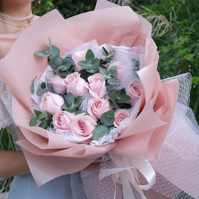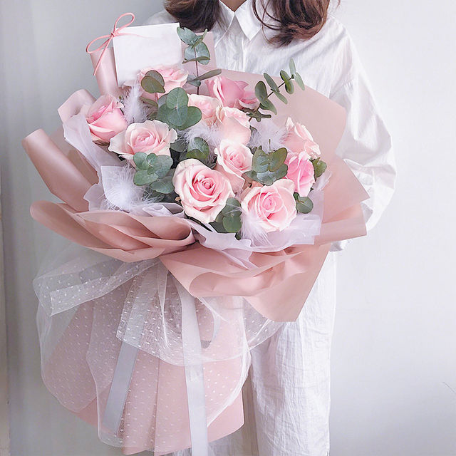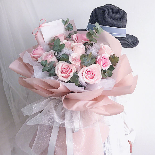 包 装:白色手揉纸内衬,粉色雾面纸韩式包装,白纱外围