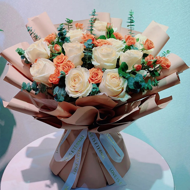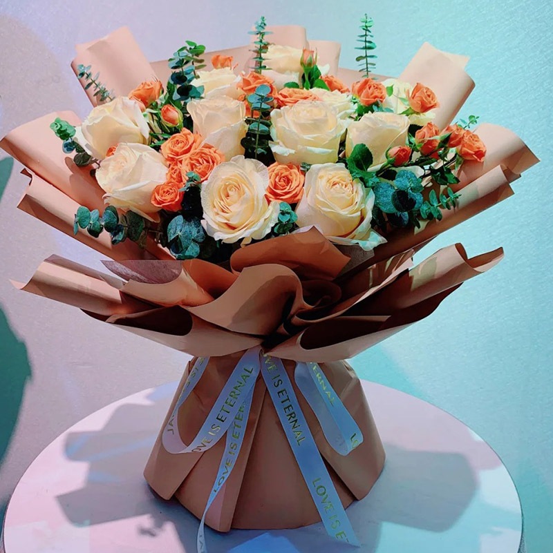 花 材:11朵香槟玫瑰,6支多头橙色小玫瑰,搭配尤加利叶装饰。