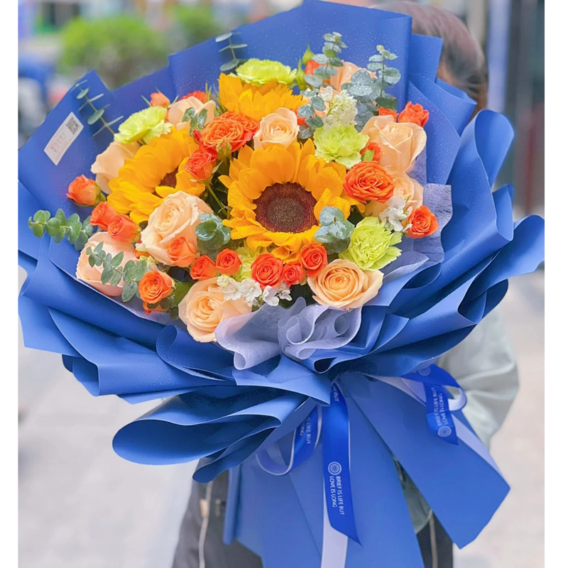 花材: 3支向日葵,11朵香槟玫瑰,搭配4支洋桔梗,6支多头橙色泡泡,尤加利叶装饰。