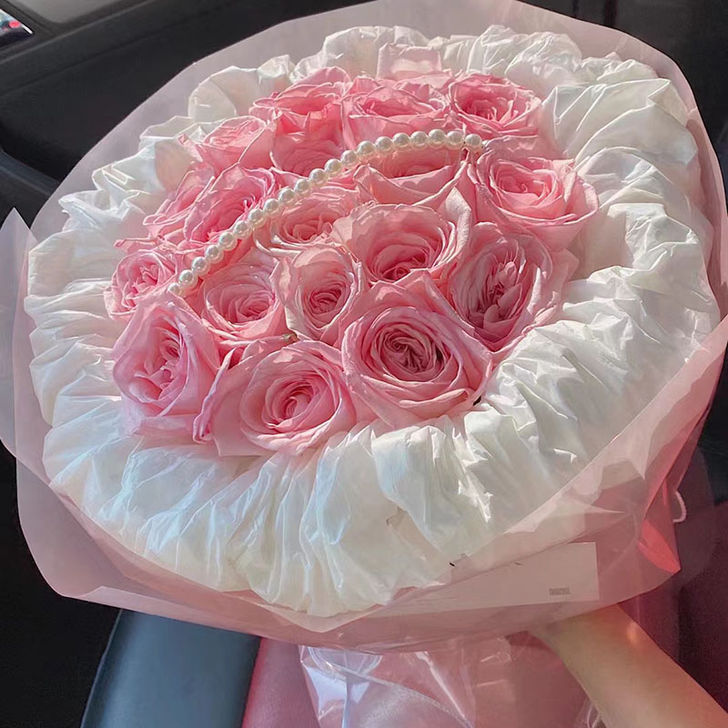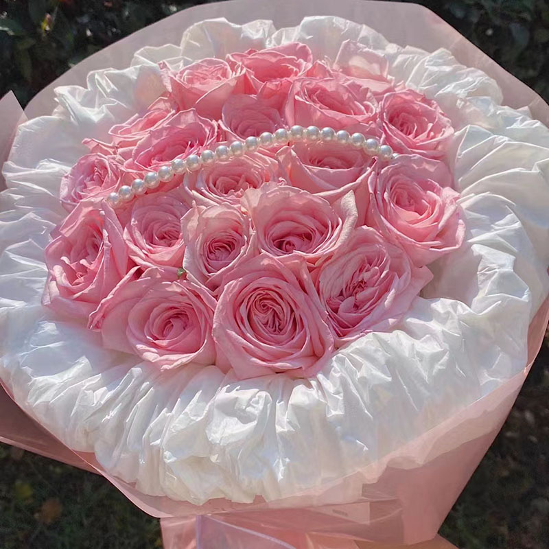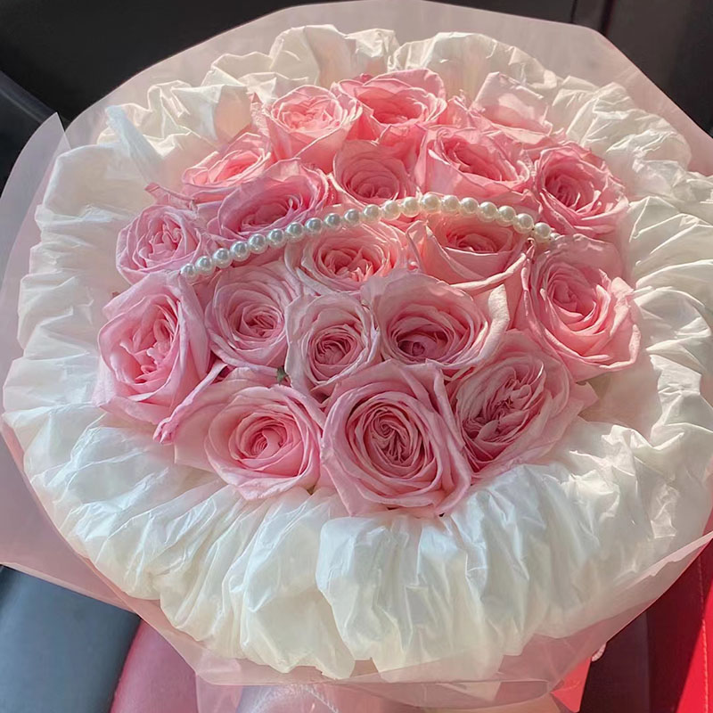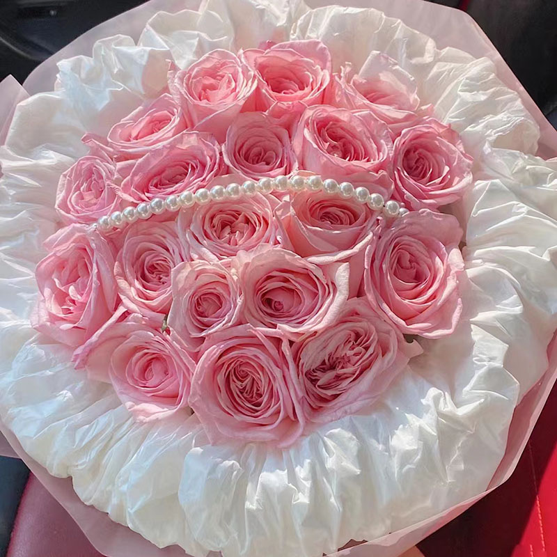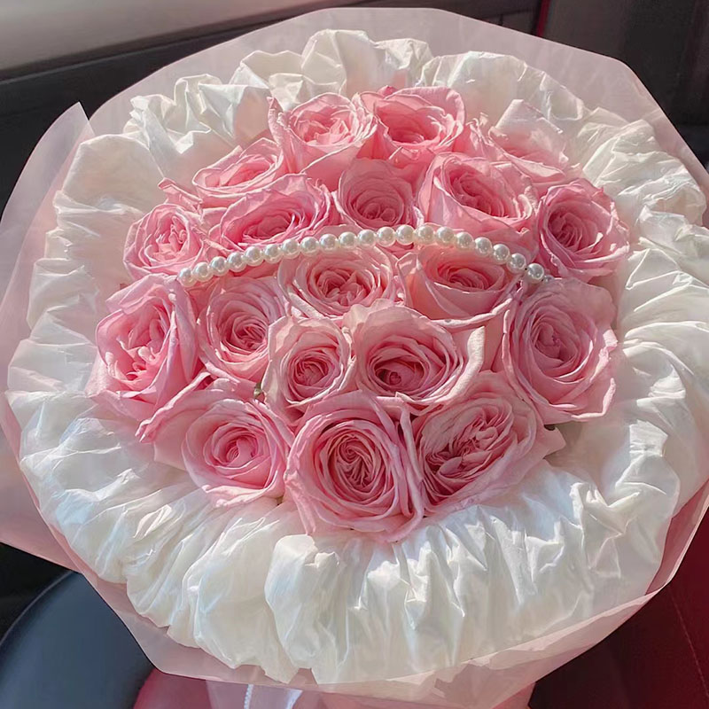 花 材:19朵粉荔枝玫瑰,珠串装饰花面。