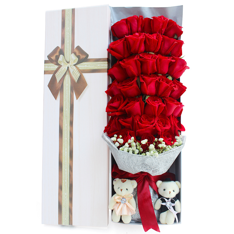 花 材:33支精品红玫瑰+2只可爱小熊,搭配适量白色满天星