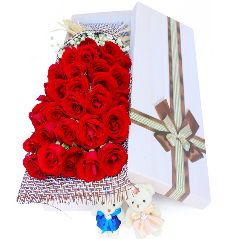 花材: 33支精品红玫瑰+2只可爱小熊,搭配适量白色满天星