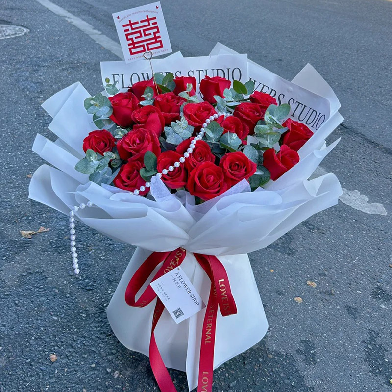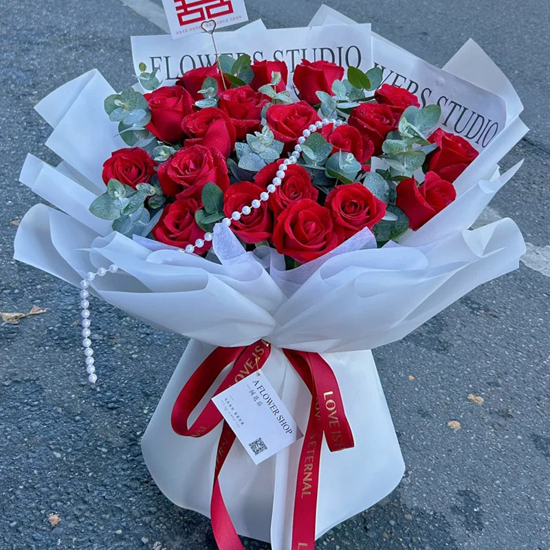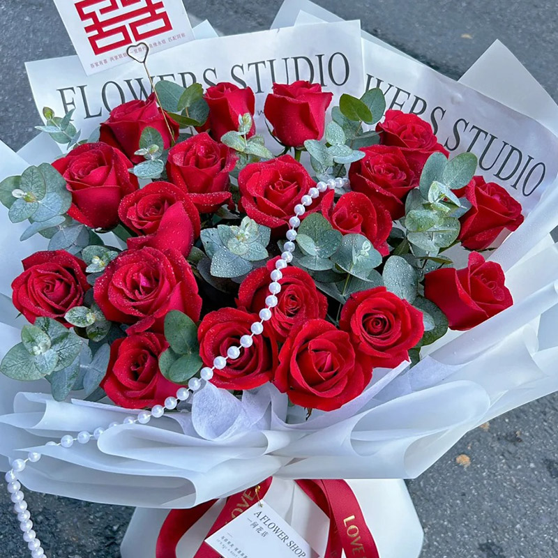 花材: 19朵红玫瑰,珠串装饰花面,尤加利叶间插。
