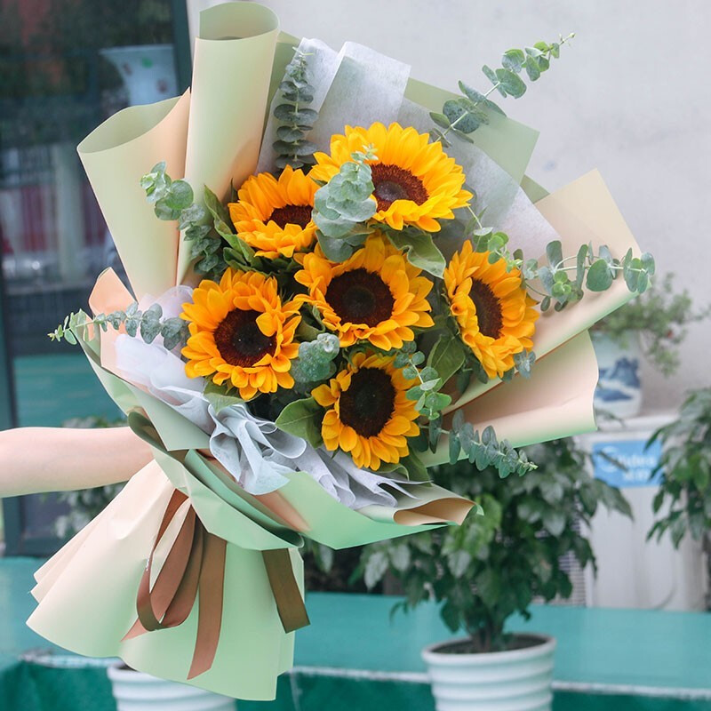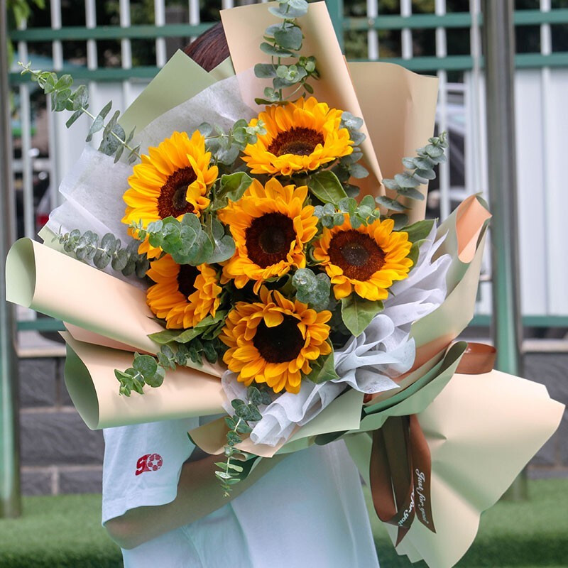 花材: 精选6支向日葵,搭配尤加利叶、绿叶装饰。