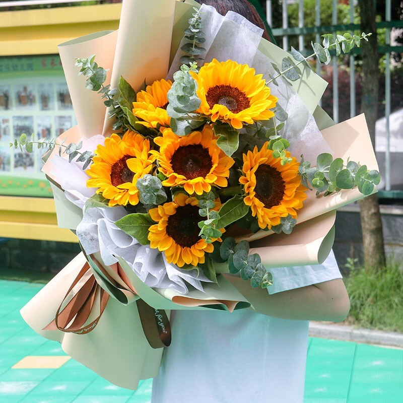 花 材:精选6支向日葵,搭配尤加利叶、绿叶装饰。
