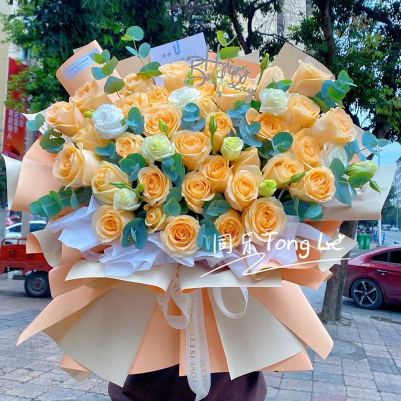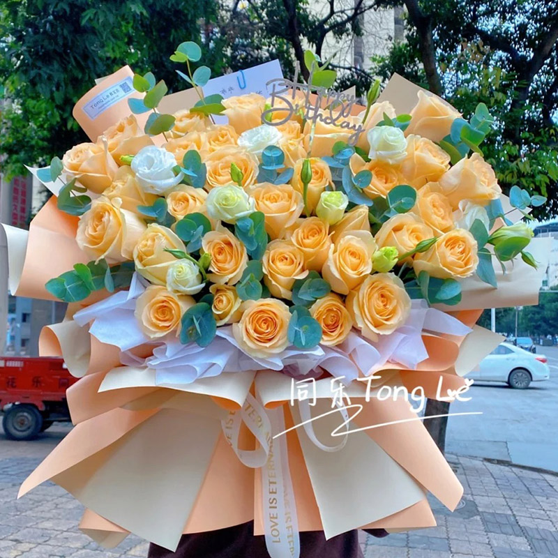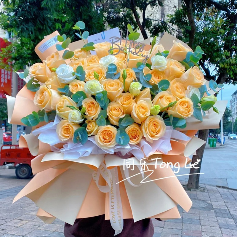 花材: 33支精品香槟玫瑰,搭配5支洋桔梗(断货则用同数量白玫瑰代替),尤加利叶装饰。