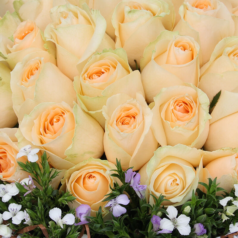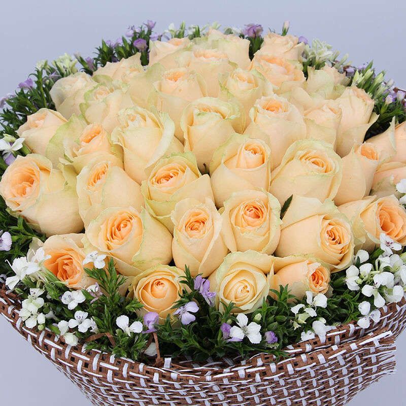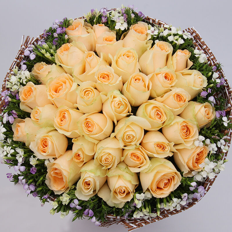 花 材:33朵精品香槟玫瑰,相思梅丰满环绕。
