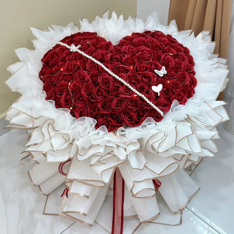 花 材:精选99朵红玫瑰,1条灯带,1条珠链,花型心形造型,缎带花面装饰。