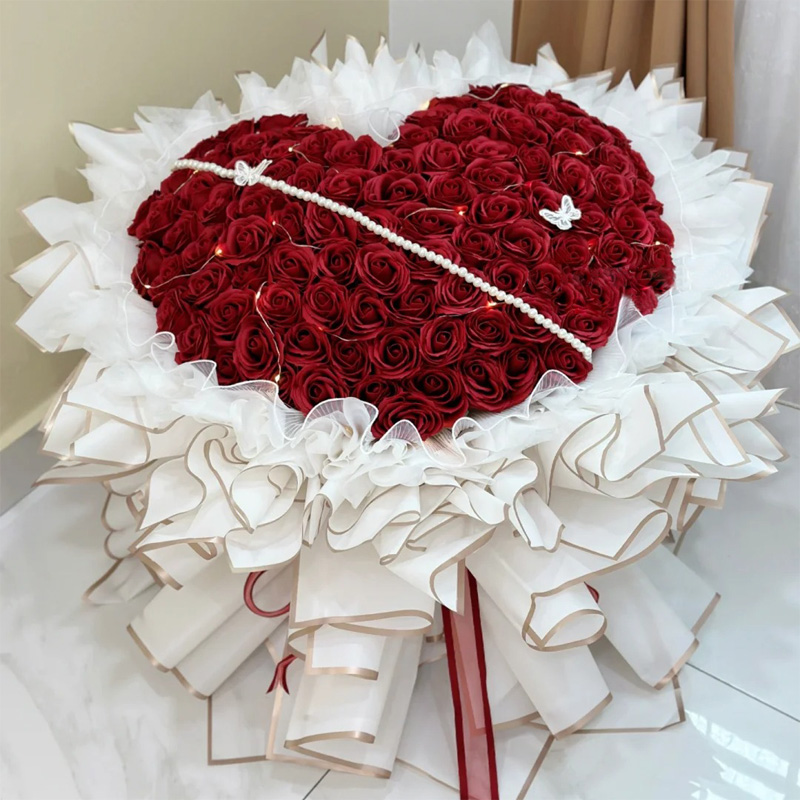 花材: 精选99朵红玫瑰,1条灯带,1条珠链,花型心形造型,缎带花面装饰。