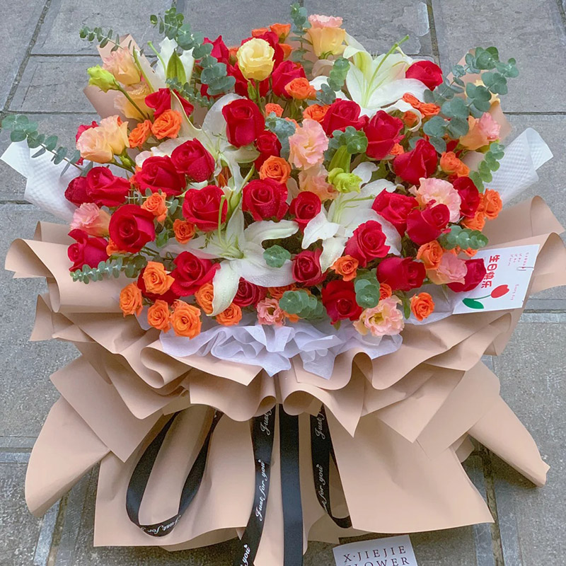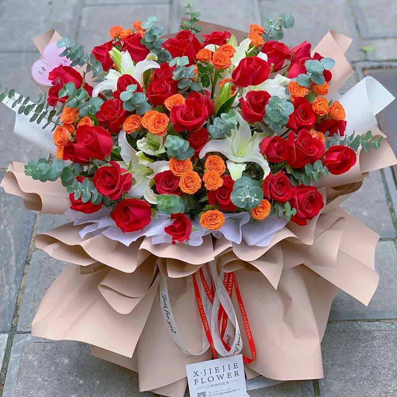 花材: 36朵红玫瑰,4支白色多头香水百合,6支橙色多头小玫瑰(断货则用同数量洋桔梗代替),尤加利叶间插。