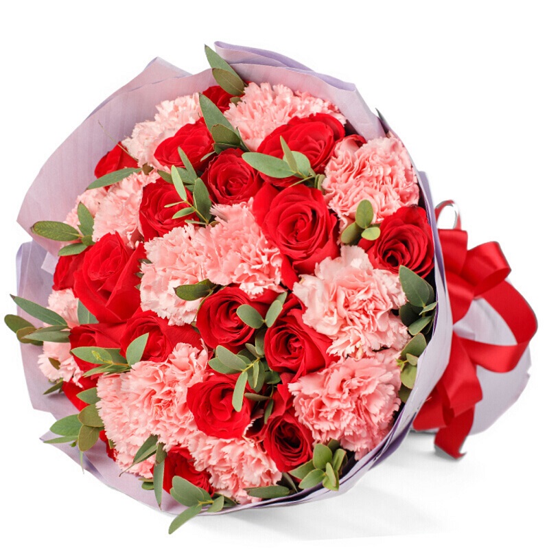 花材: 19朵红玫瑰,16朵粉色康乃馨,绿叶搭配