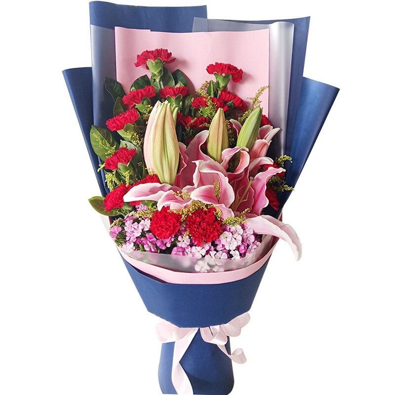 花 材:19朵红色康乃馨,2枝多头粉百合,粉色石竹梅丰满搭配,黄莺间插,栀子叶点缀