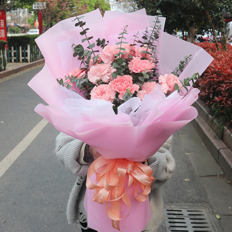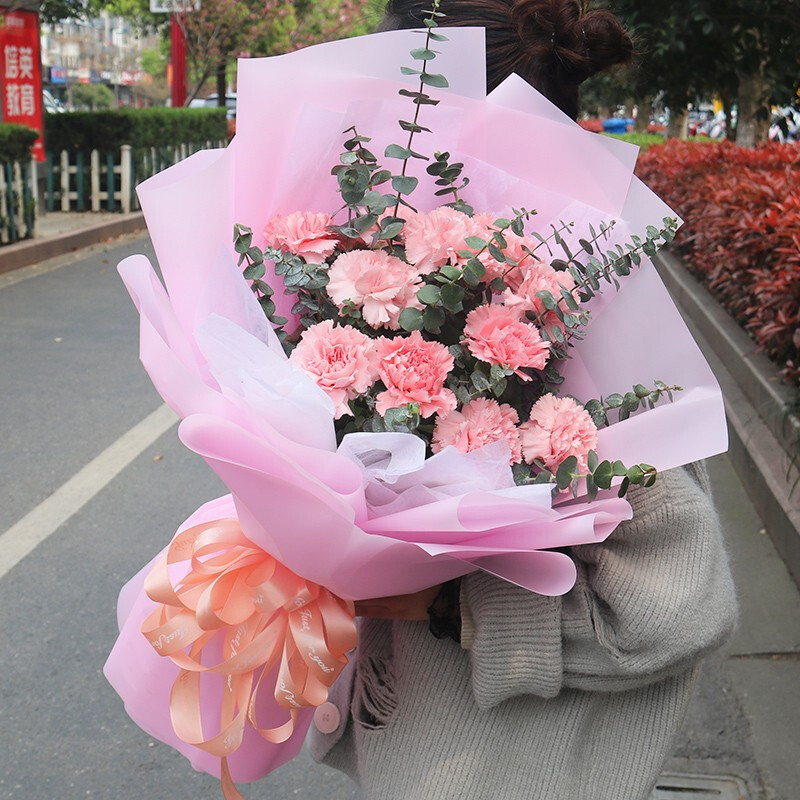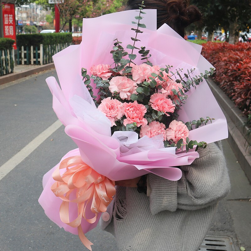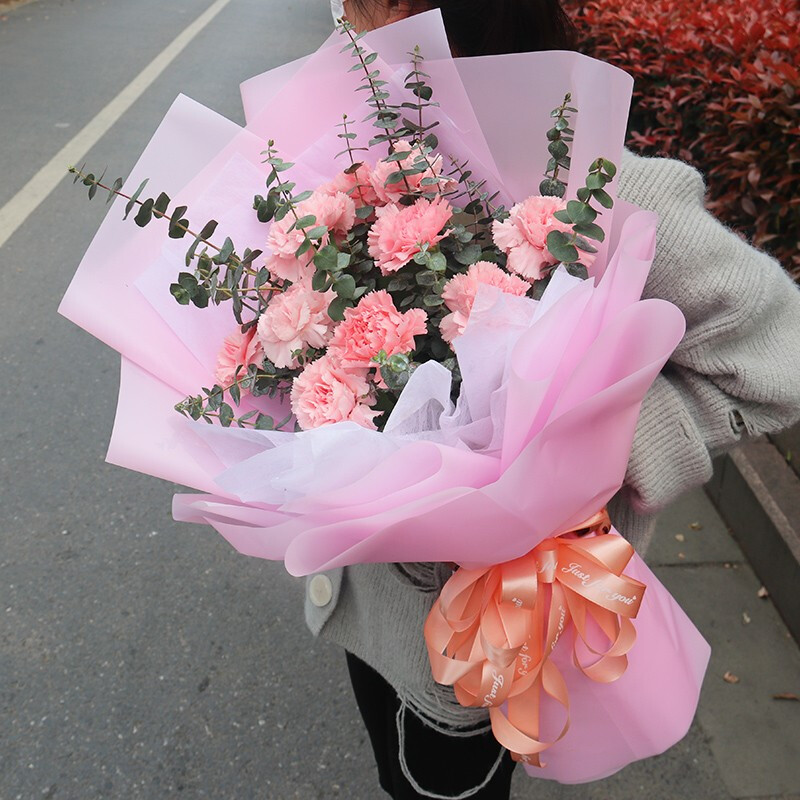 花材: 11朵粉色康乃馨,搭配尤加利叶。