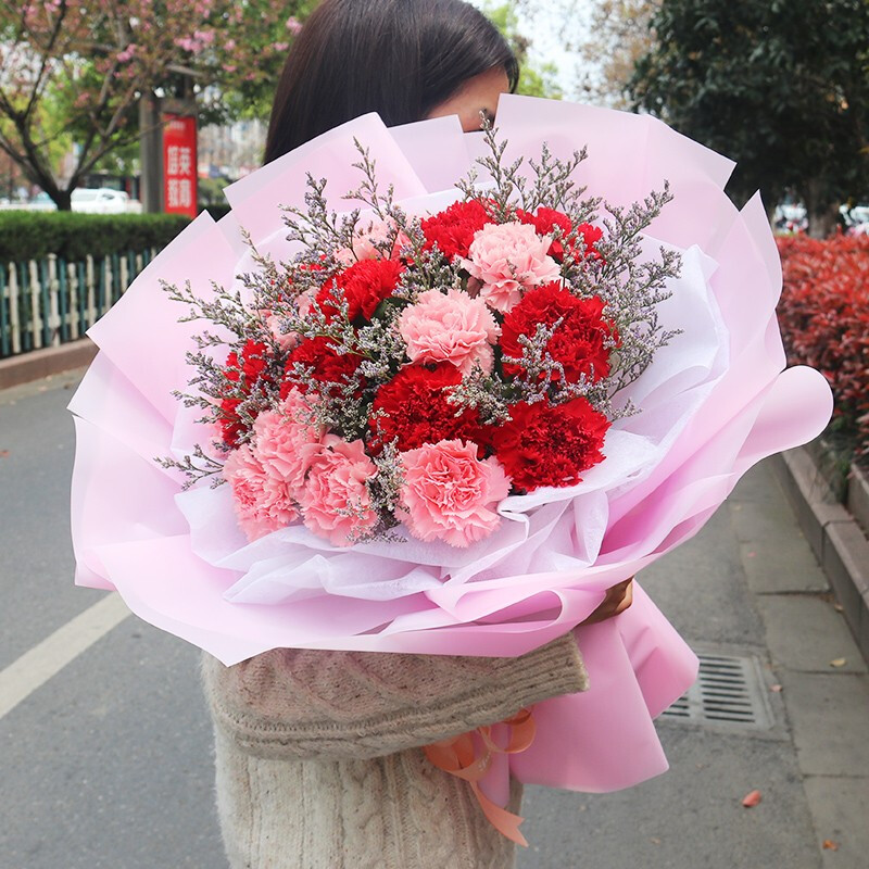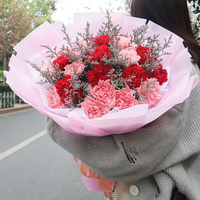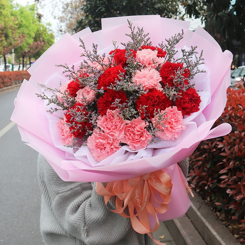 花 材:19朵红色、粉色康乃馨混搭,搭配情人草等配花。