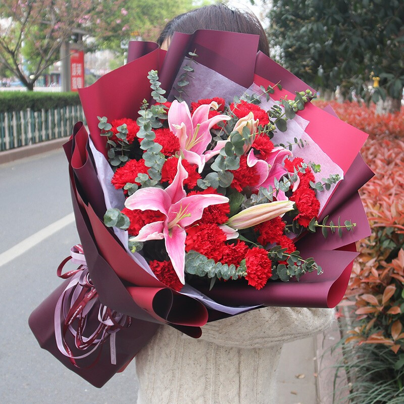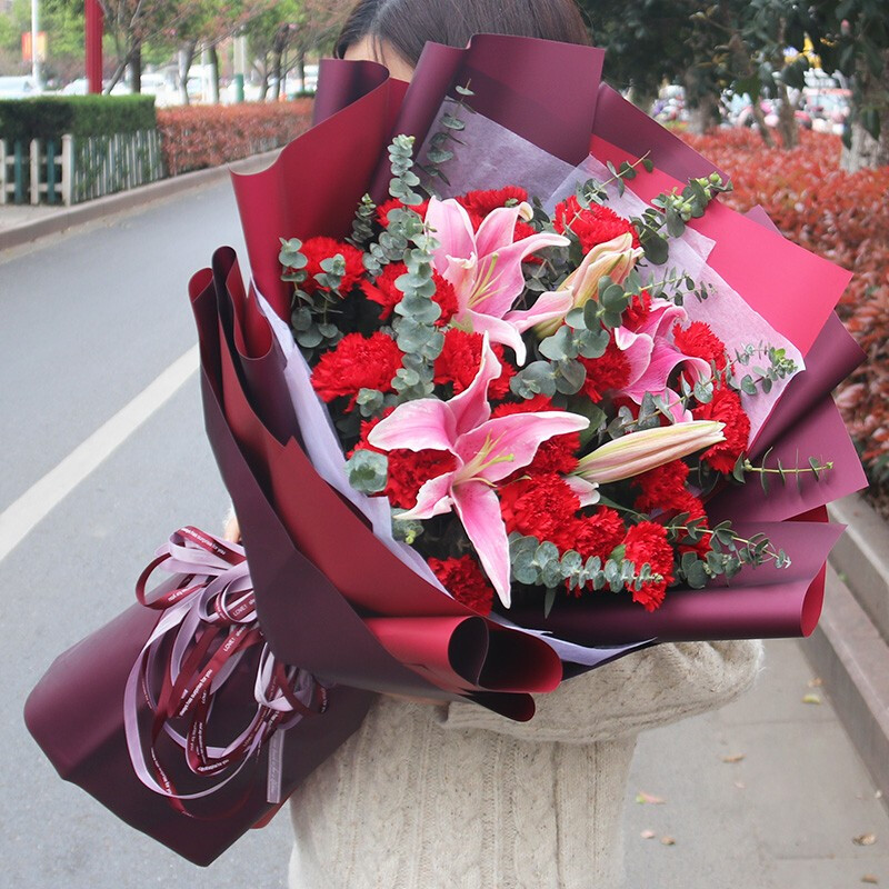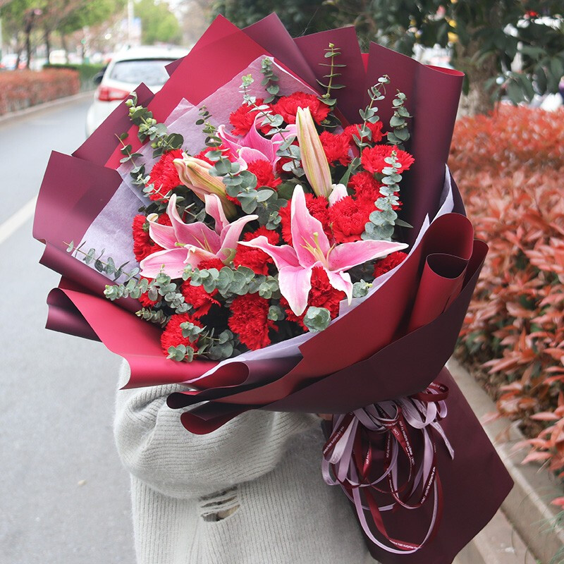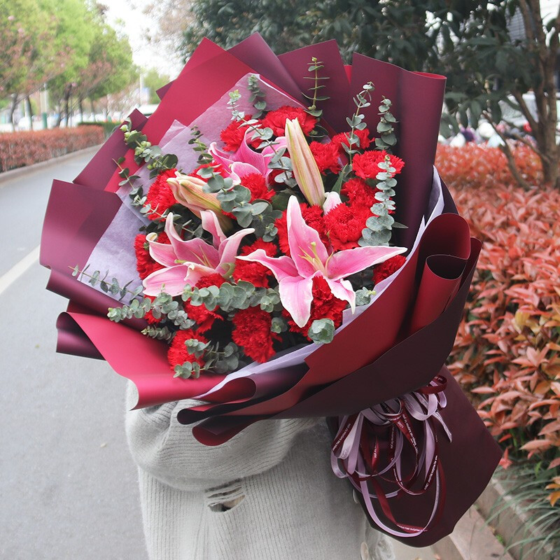花材: 19支红色康乃馨,2支多头粉百合,搭配尤加利叶、石竹梅等配花。