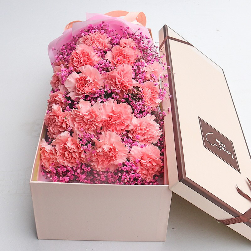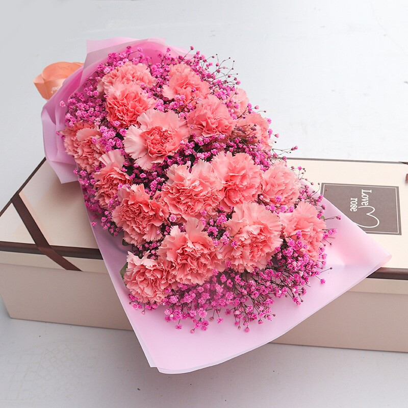 花材: 精选19朵粉色康乃馨,搭配粉色满天星装饰。