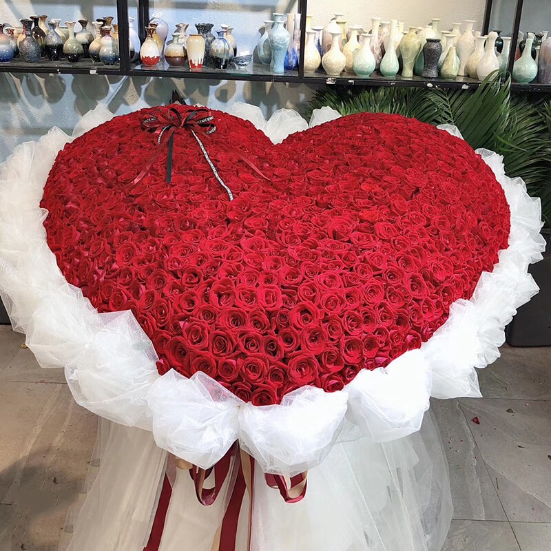 花 材:精选999朵红玫瑰,饱满心形造型,同色系蝴蝶结左上角表面装饰。