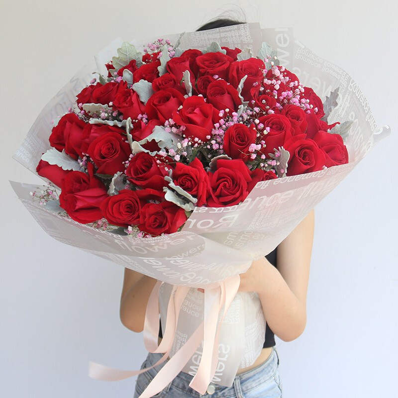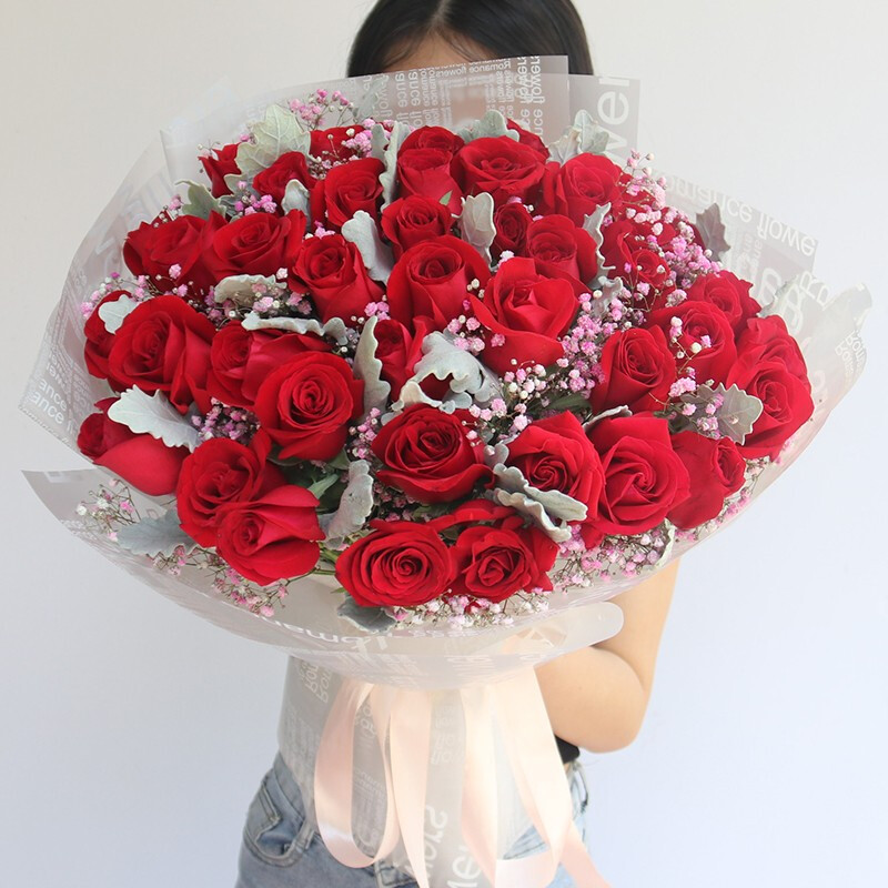 花材: 精选39朵红玫瑰,搭配粉色满天星,银叶菊装饰。