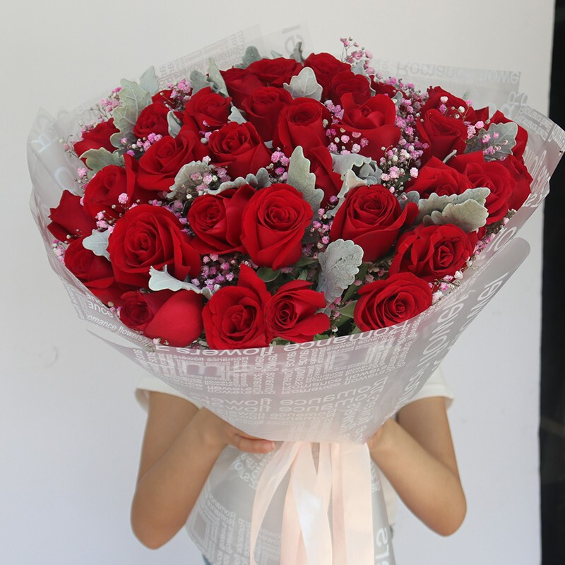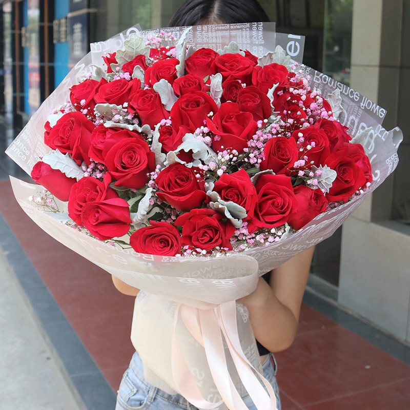 花 材:精选39朵红玫瑰,搭配粉色满天星,银叶菊装饰。