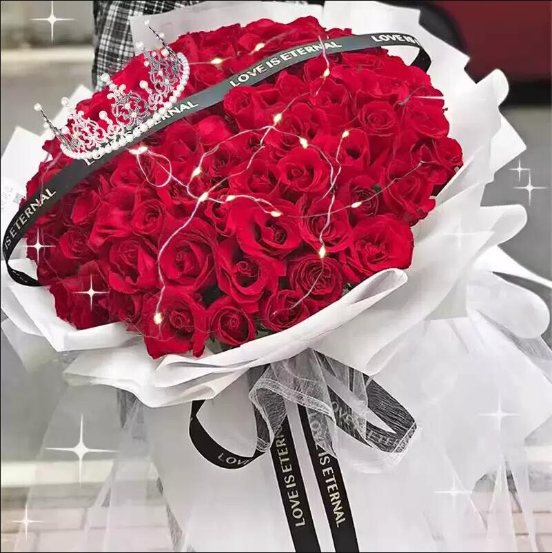 花 材:99支精品红玫瑰,1条灯带,1个皇冠(样式随机),黑色英文缎带装饰花面。