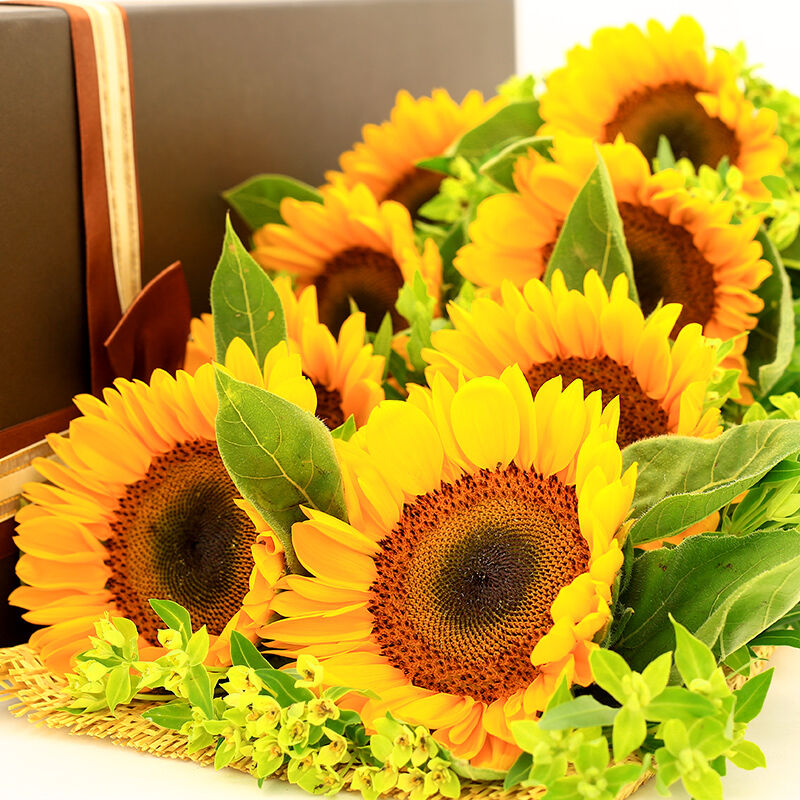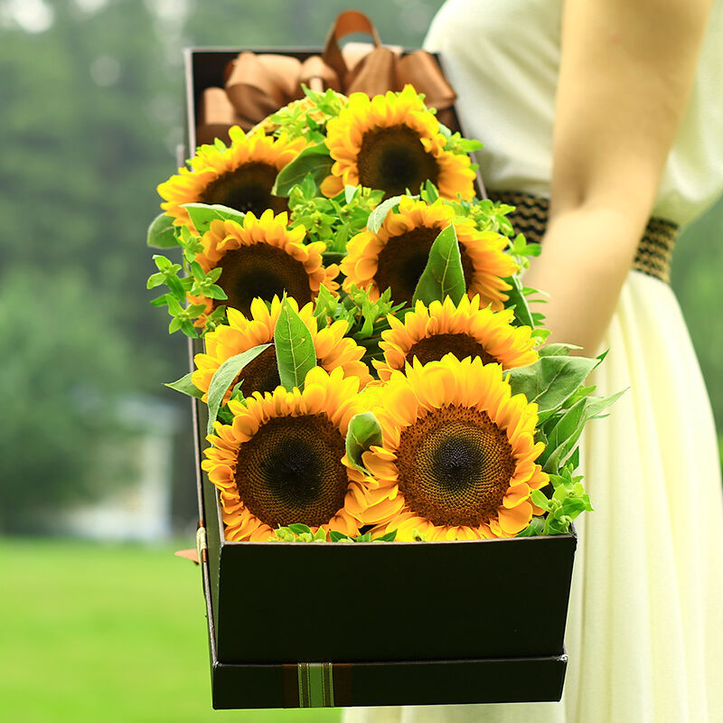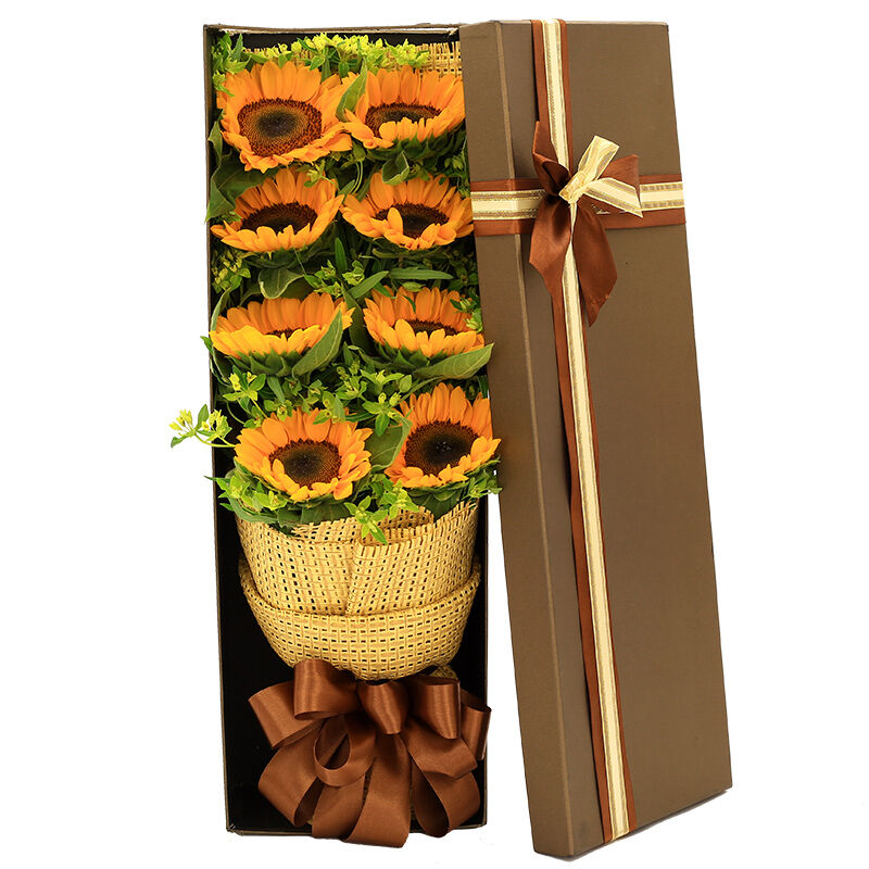 花材: 精选8支向日葵,搭配黄莺、绿叶装饰。