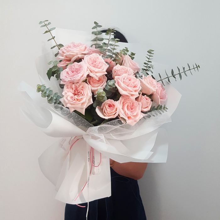 花材: 19支精品粉玫瑰(荔枝玫瑰),搭配适量尤加利叶装饰。
