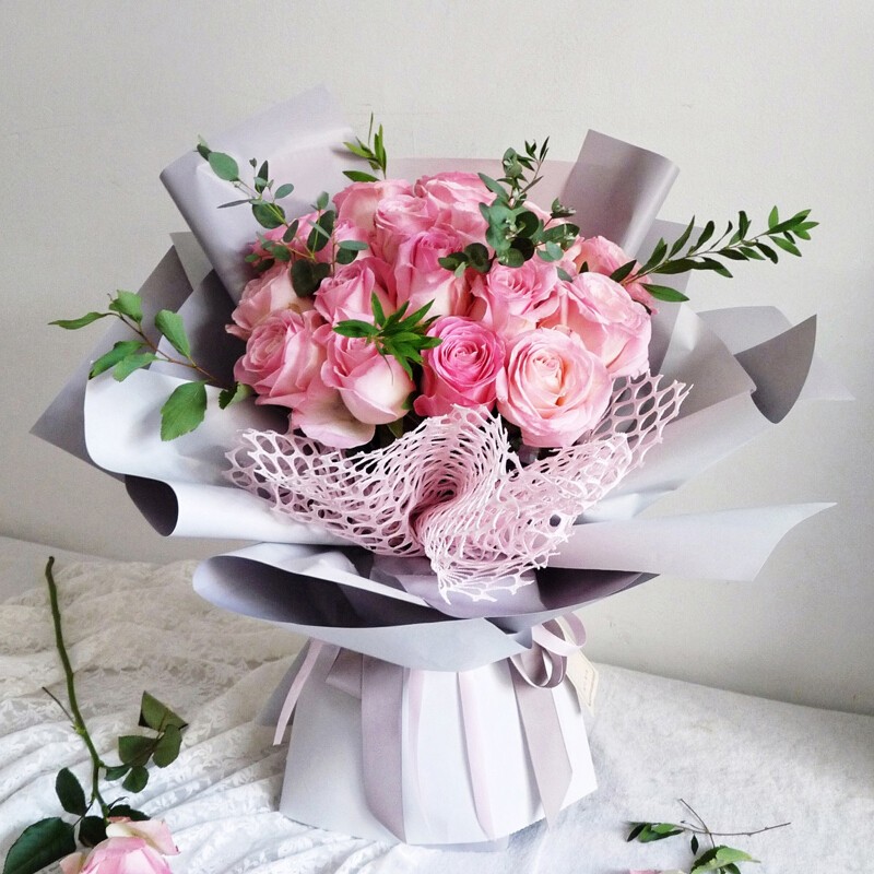 花材: 19朵精品粉玫瑰,搭配尤加利叶,绿叶装饰。