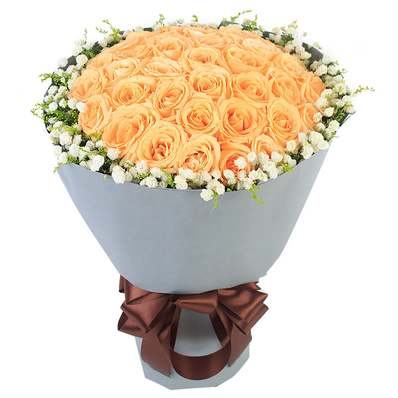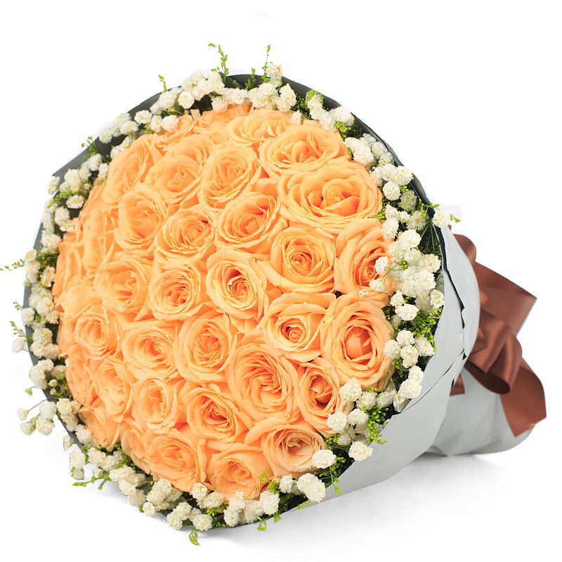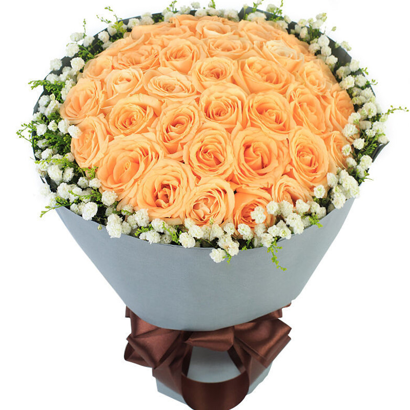 花材: 33支精品香槟玫瑰,外围搭配适量白色满天星、黄莺。