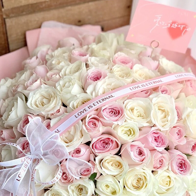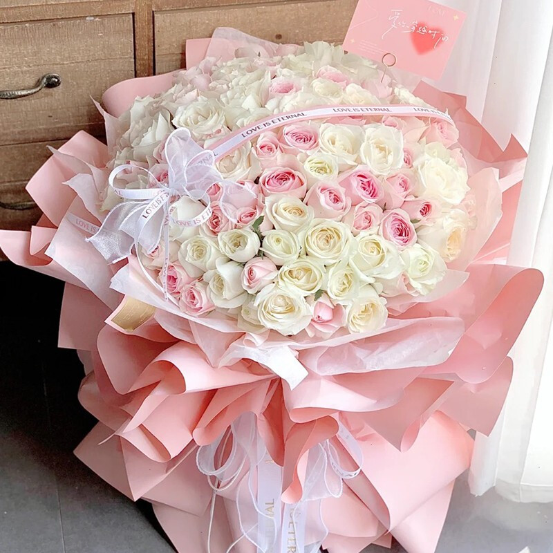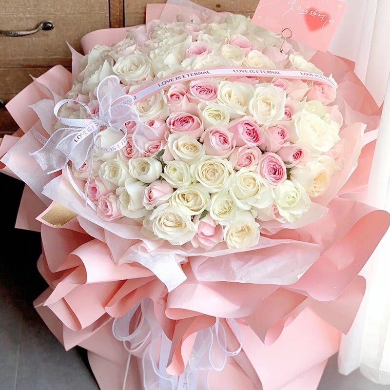 花材: 精选99朵白色、粉色玫瑰(白玫瑰大概占2/3),1只蕾丝蝴蝶结、1条粉白色缎带装饰花面。