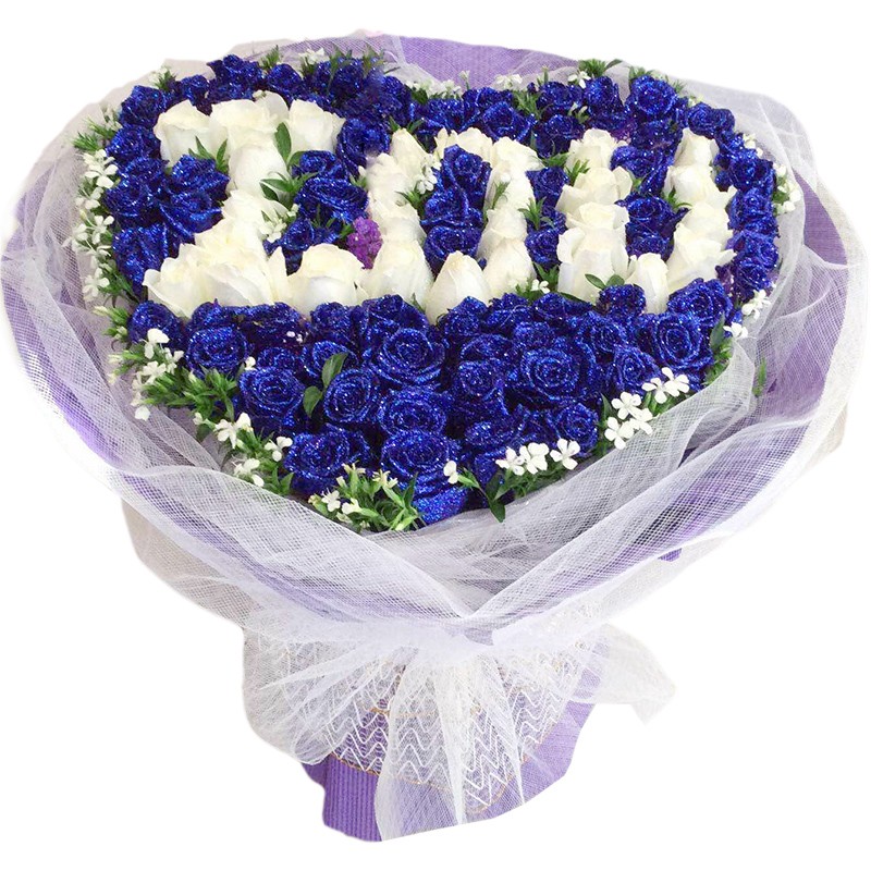花 材:99支精品混色玫瑰(蓝色妖姬外围、白玫瑰做成IOU字形),搭配适量白色相思梅。