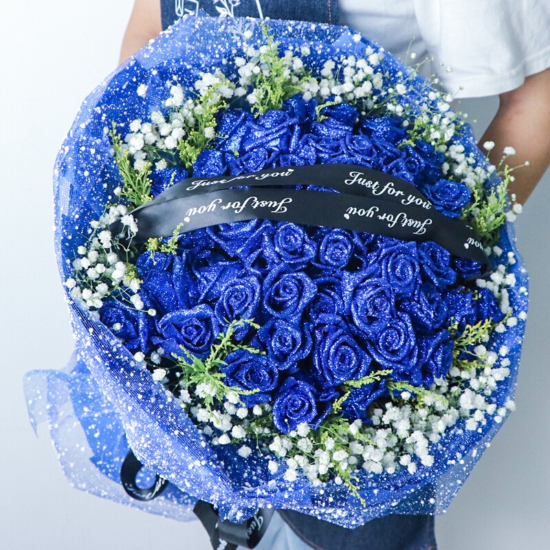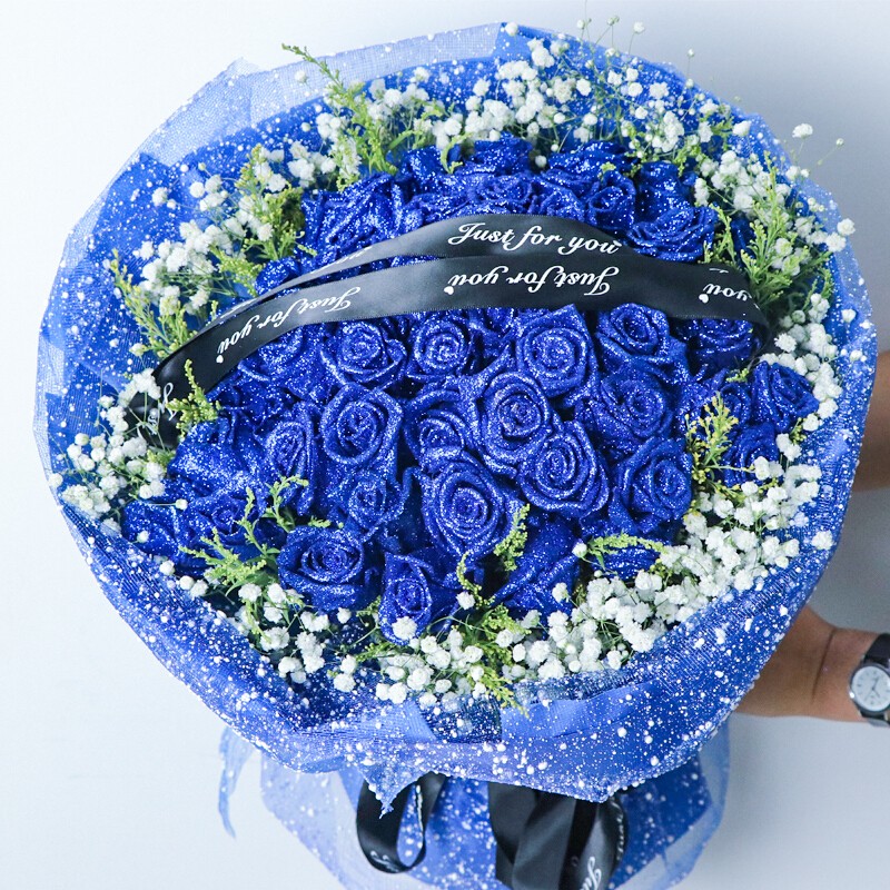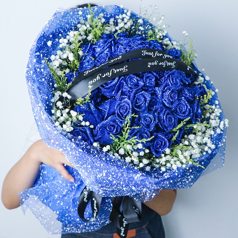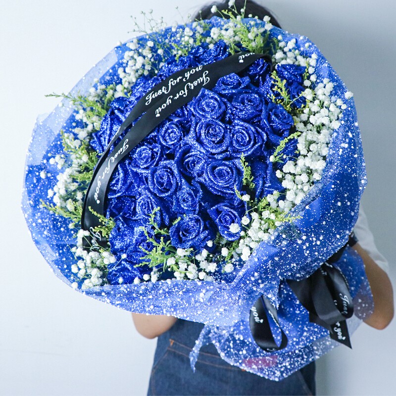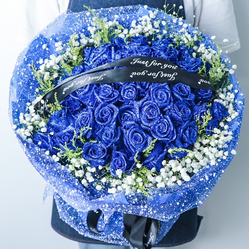 花材: 52朵蓝色妖姬,搭配黄莺满天星外围环绕,花面礼品缎带装饰。