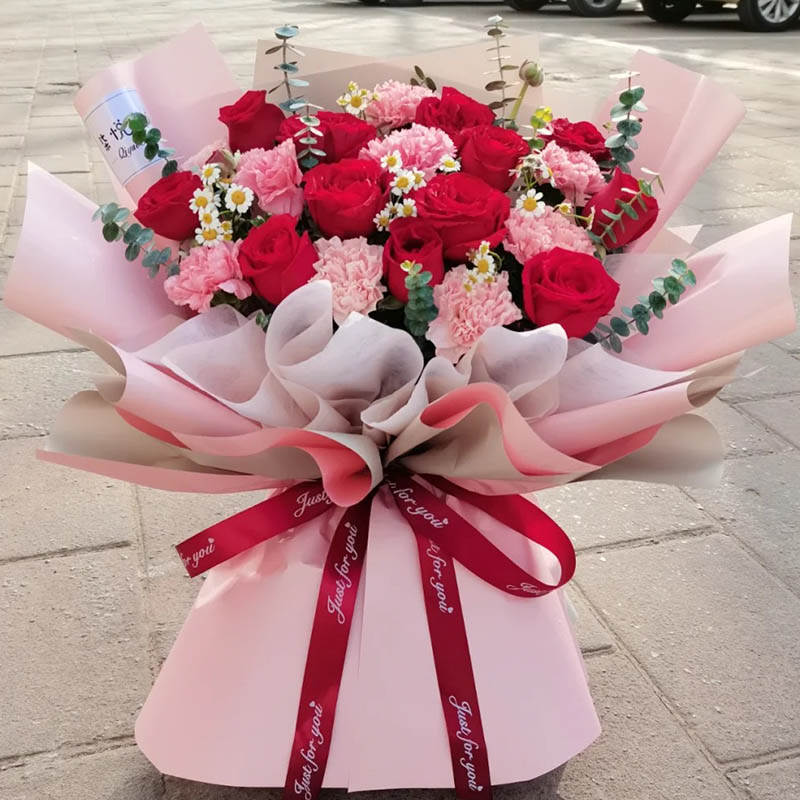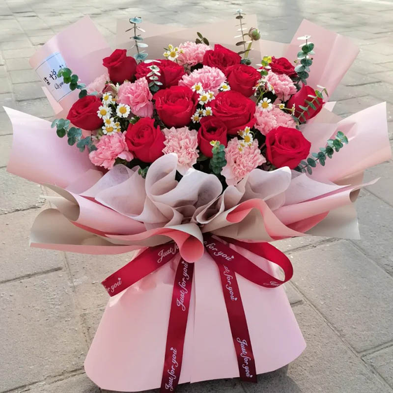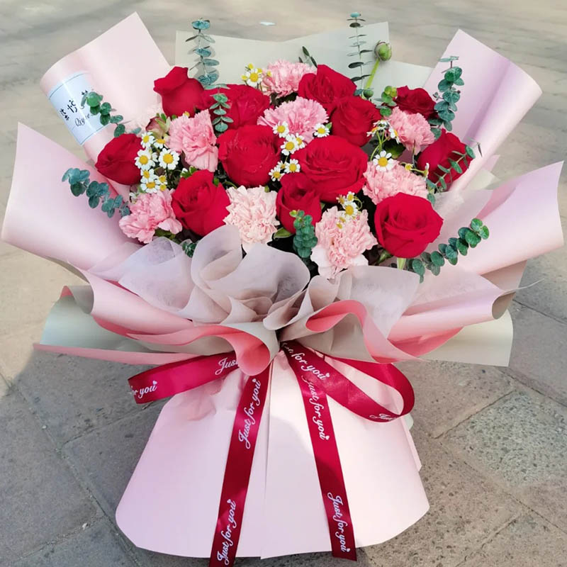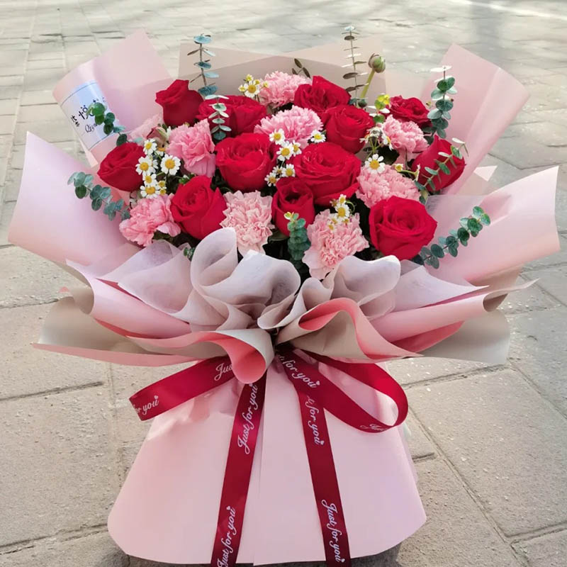花材: 20朵混搭红玫瑰和粉色康乃馨(12朵红玫瑰、8朵粉色康乃馨),搭配尤加利叶、洋甘菊装饰。