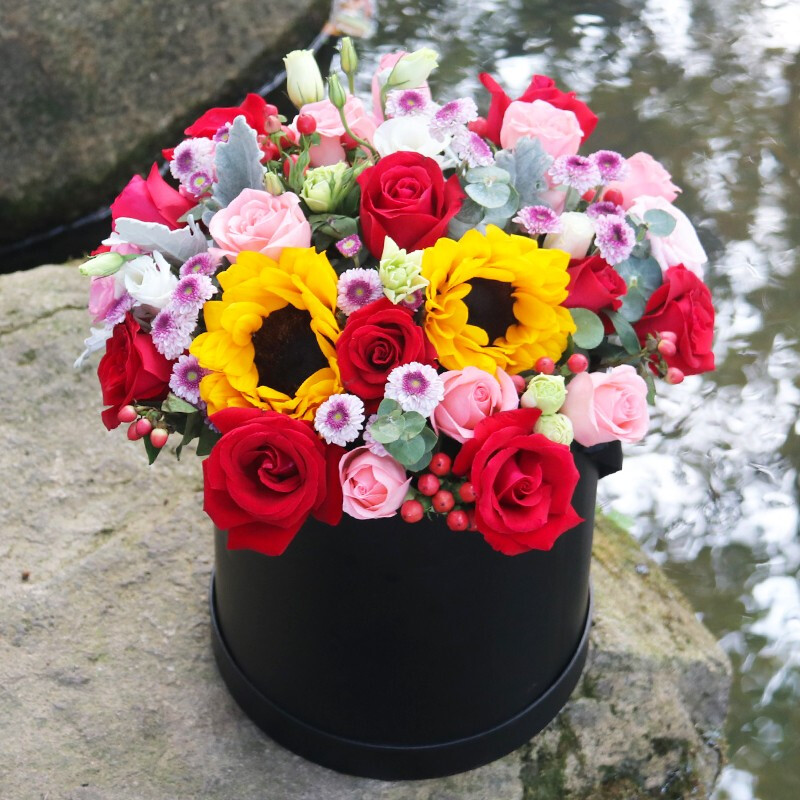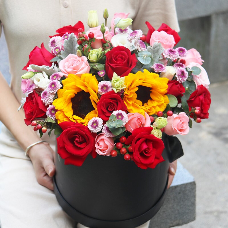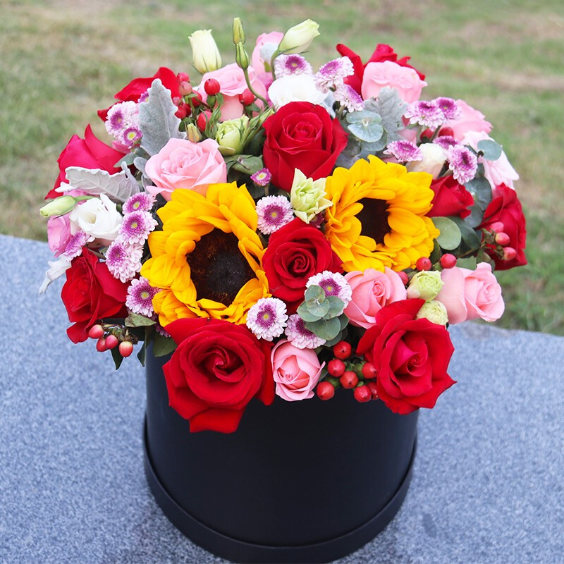 花 材:11朵红玫瑰,11朵红玫瑰,2朵向日葵,搭配桔梗、紫色小雏菊、尤加利叶、红豆、银叶菊装饰。