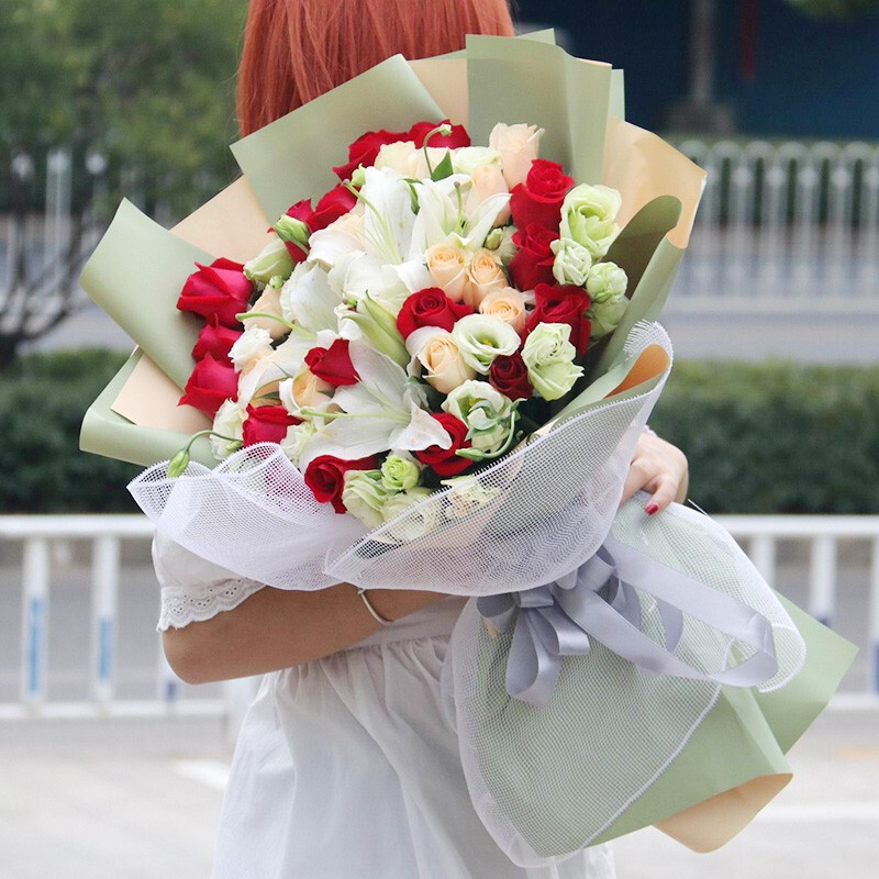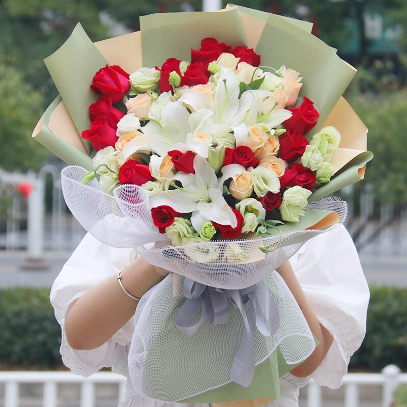 花 材:33朵玫瑰混搭(红玫瑰、香槟玫瑰),2支多头白色香水百合,桔梗装饰。