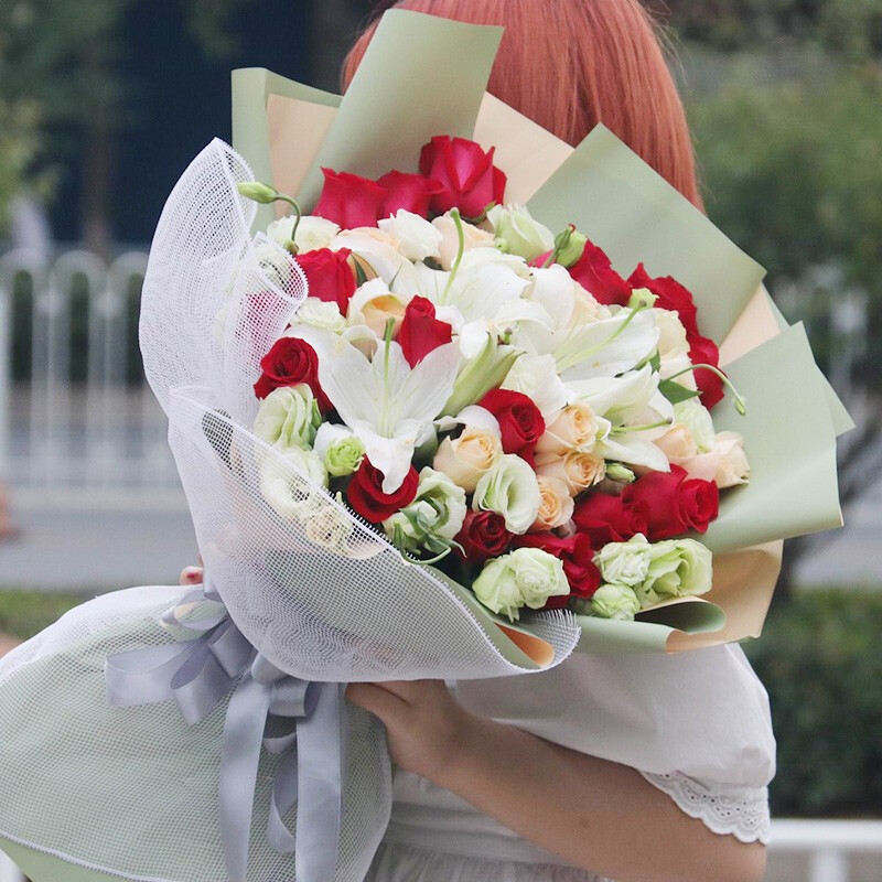 花材: 33朵玫瑰混搭(红玫瑰、香槟玫瑰),2支多头白色香水百合,桔梗装饰。