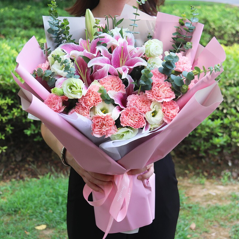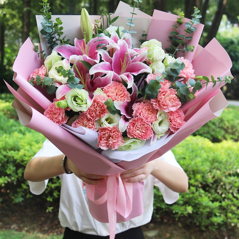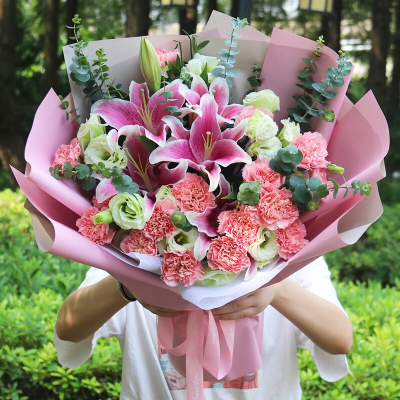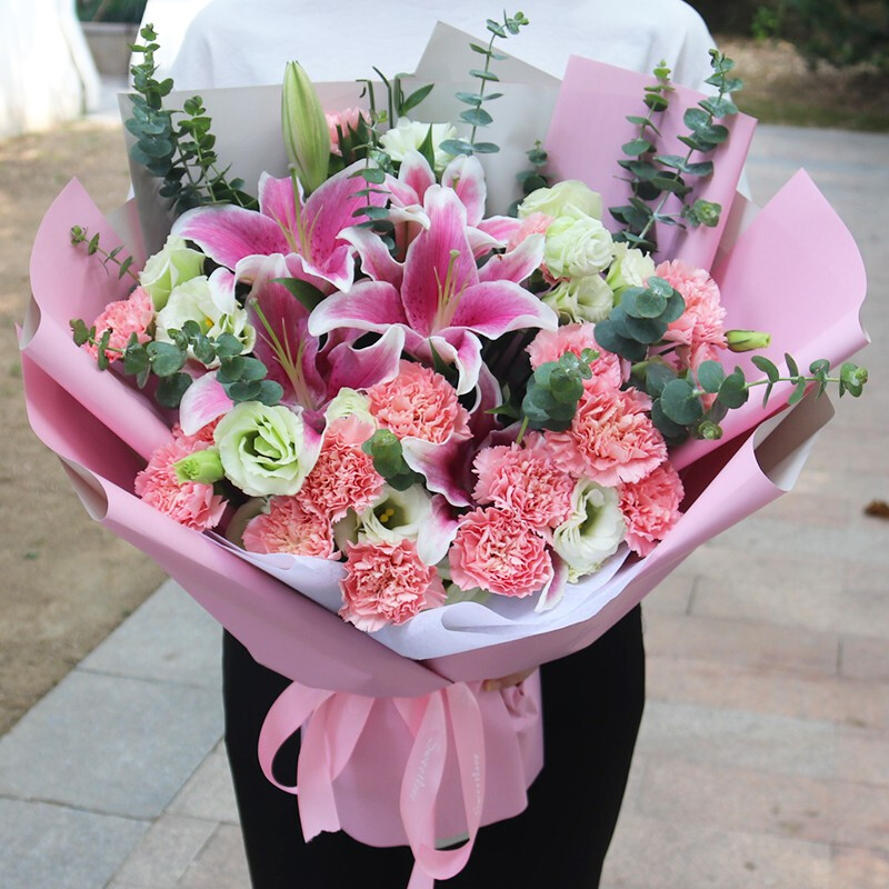 花 材:19朵粉色康乃馨,2支粉色多头百合,搭配4支洋桔梗、尤加利叶装饰。