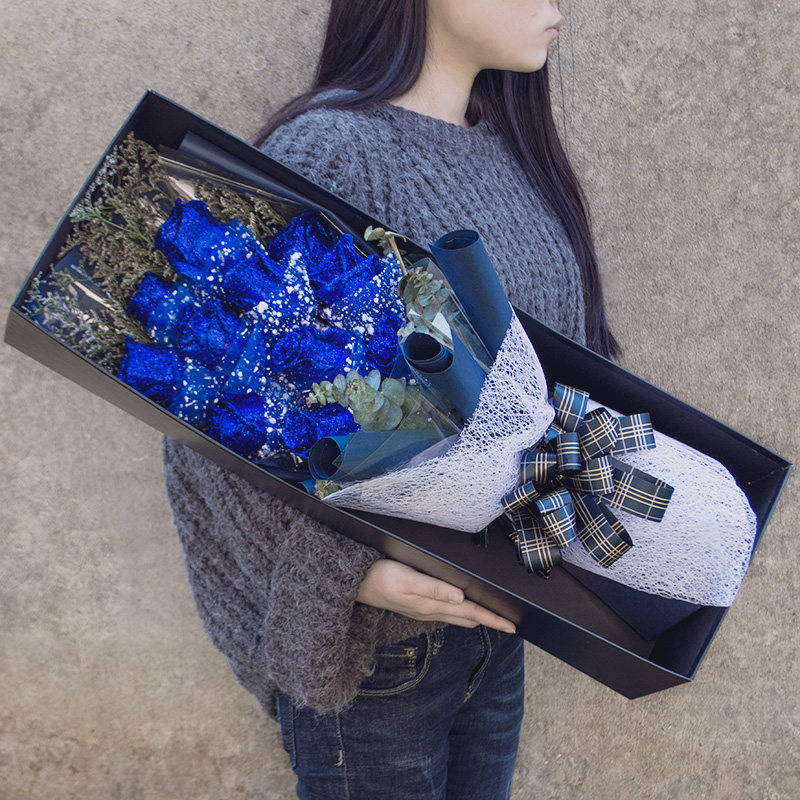 花 材:11朵精品蓝色妖姬(每朵用网纱单独包装),蓝色硬纸卷成3个圆筒装饰,搭配情人草、尤加利叶点缀。