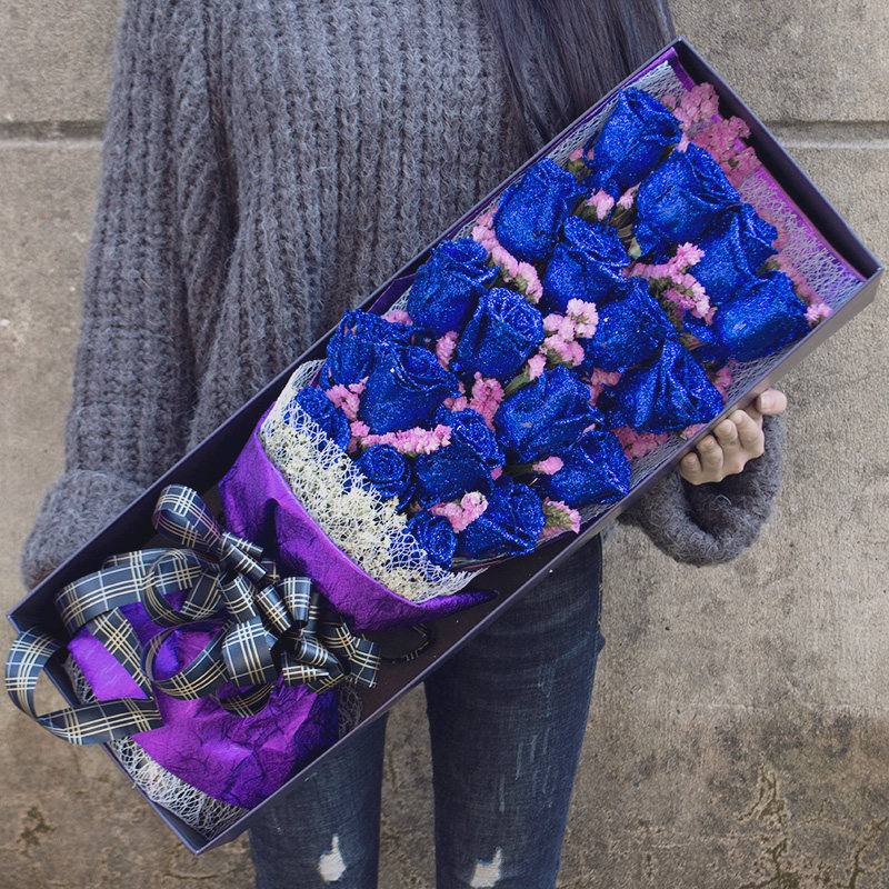 花材: 19朵蓝色妖姬,搭配粉色勿忘我、满天星装饰。