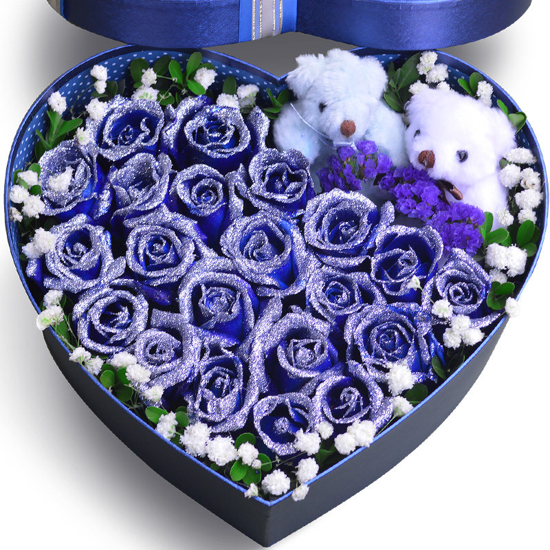 花材: 21朵蓝色妖姬,2支小熊,紫色勿忘我,白色满天星、栀子叶装饰。