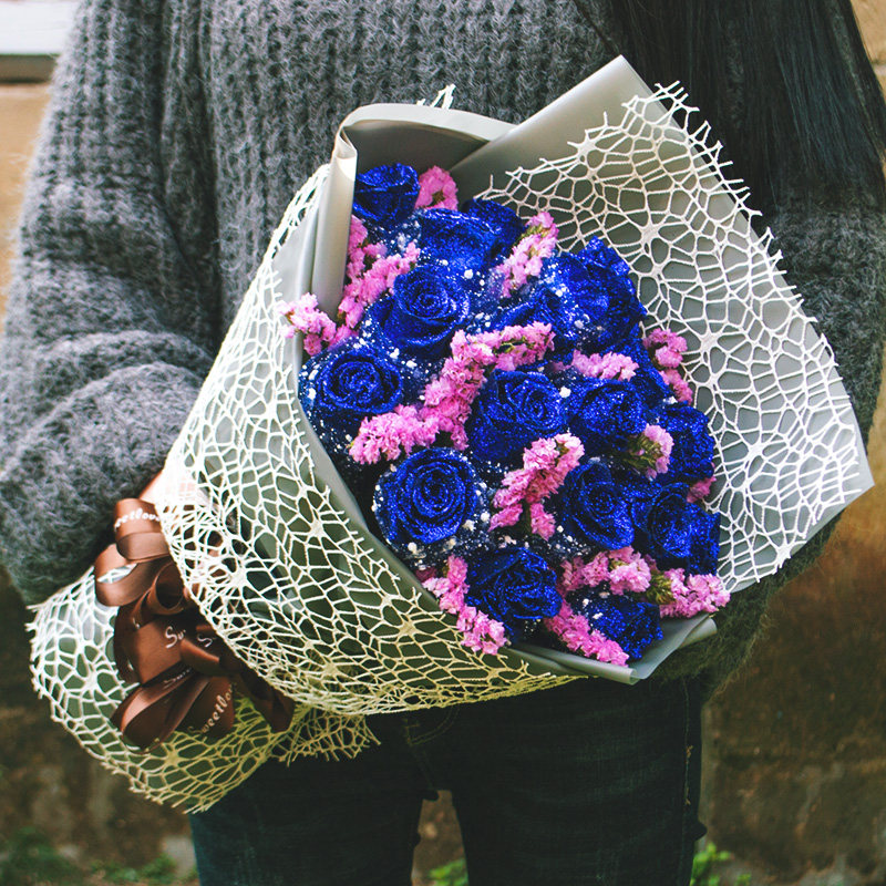 花材: 19朵蓝色妖姬,搭配粉色勿忘我装饰。